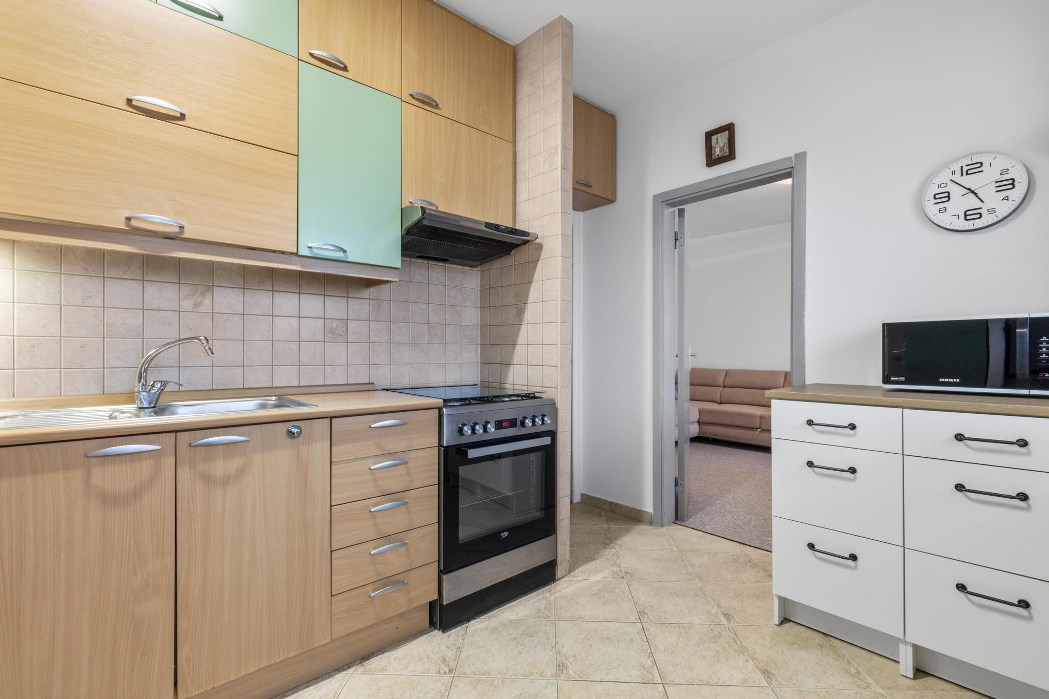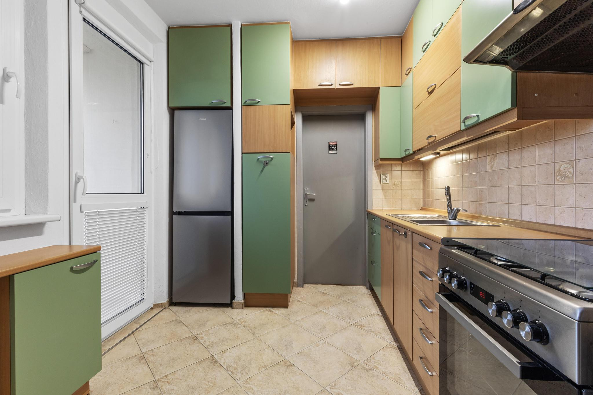 - kuchynská linka so spotrebičmi (kombinovaný plynový sporák s elektricoku rúrou, kombinovaná chladnička s mrazničkou, mikrovlnná rúra)