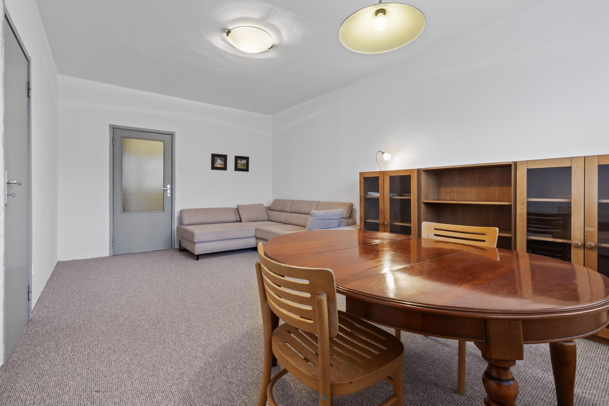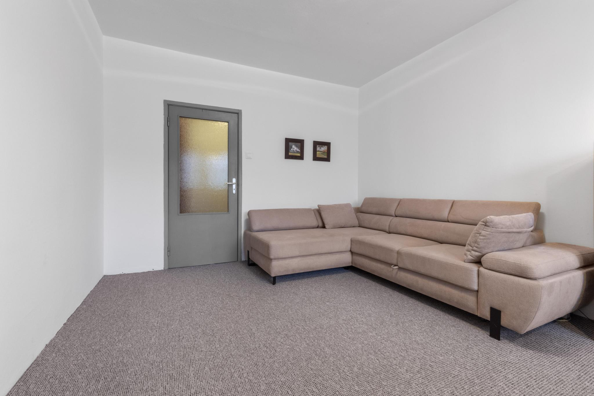 - v obývacej je izbe rohová rozťahovacia sedačka, jedálensky stôl so stoličkami