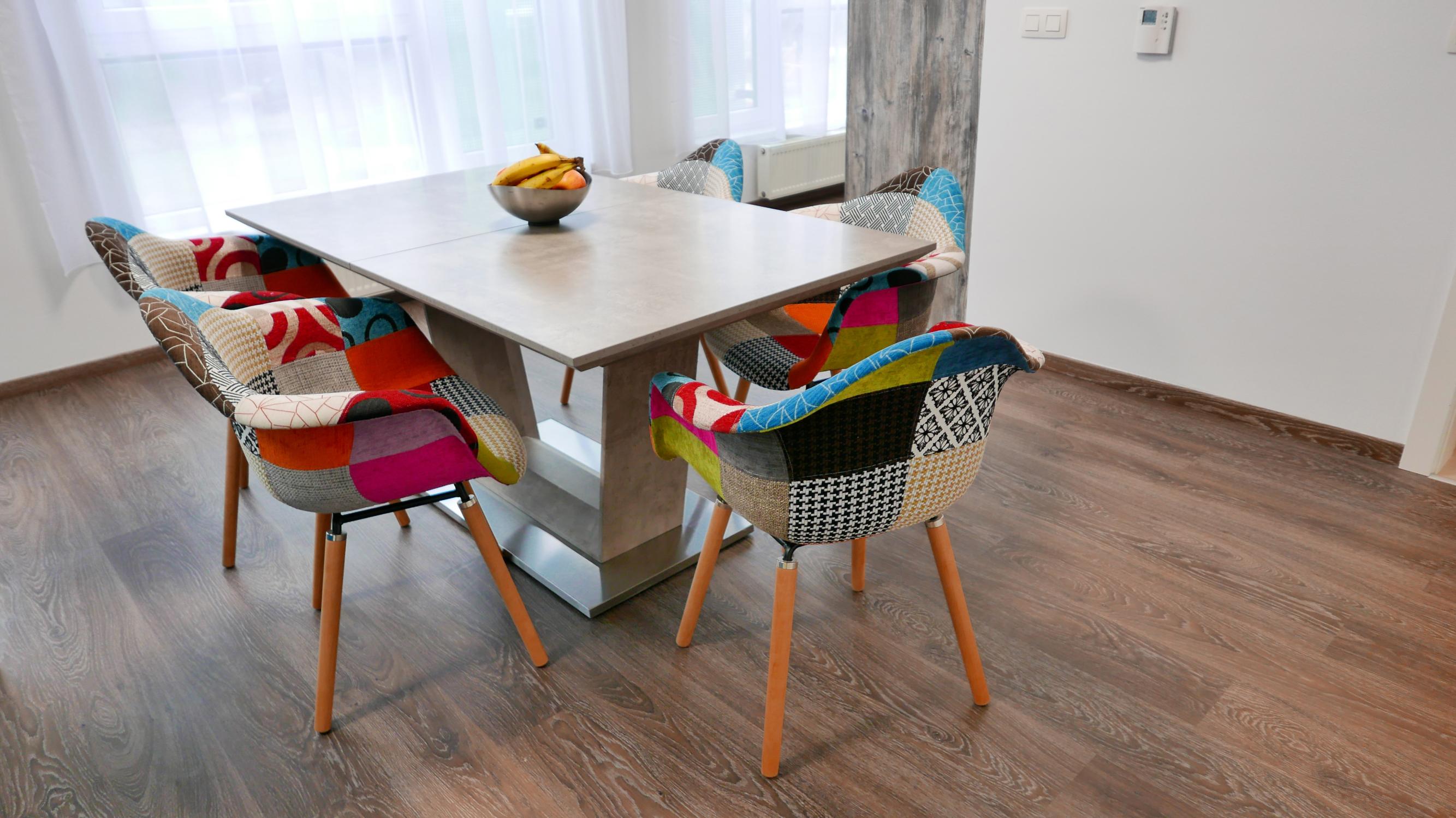 *byt je zariadený jedálenský stôl, TV, gauč, posteľ, práčka