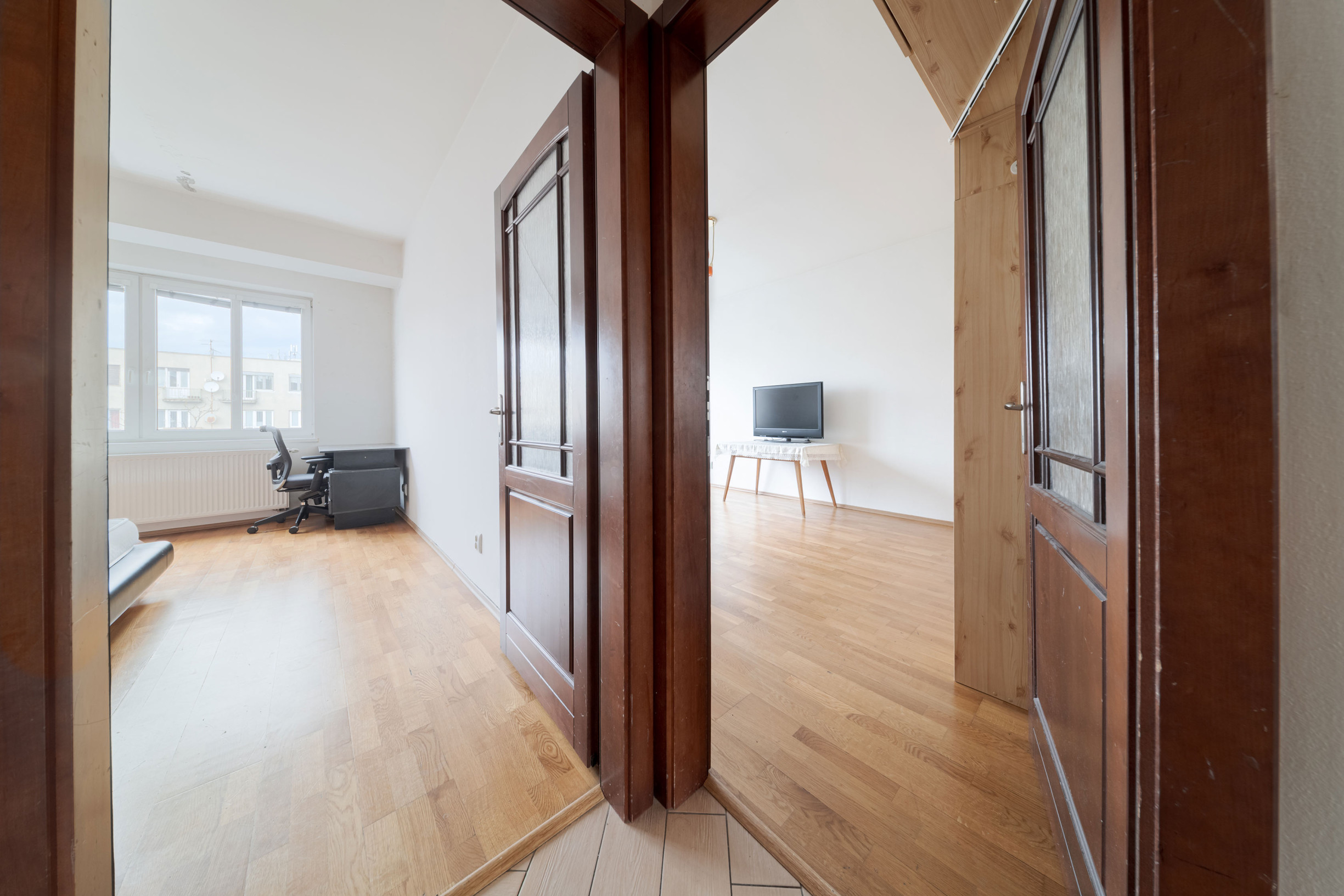 - byt disponuje dvomi priestrannými nepriechodnými izbami, obývacou izbou s kuchyňou, kúpeľňou s WC, špajzou a technickou miestnosťou