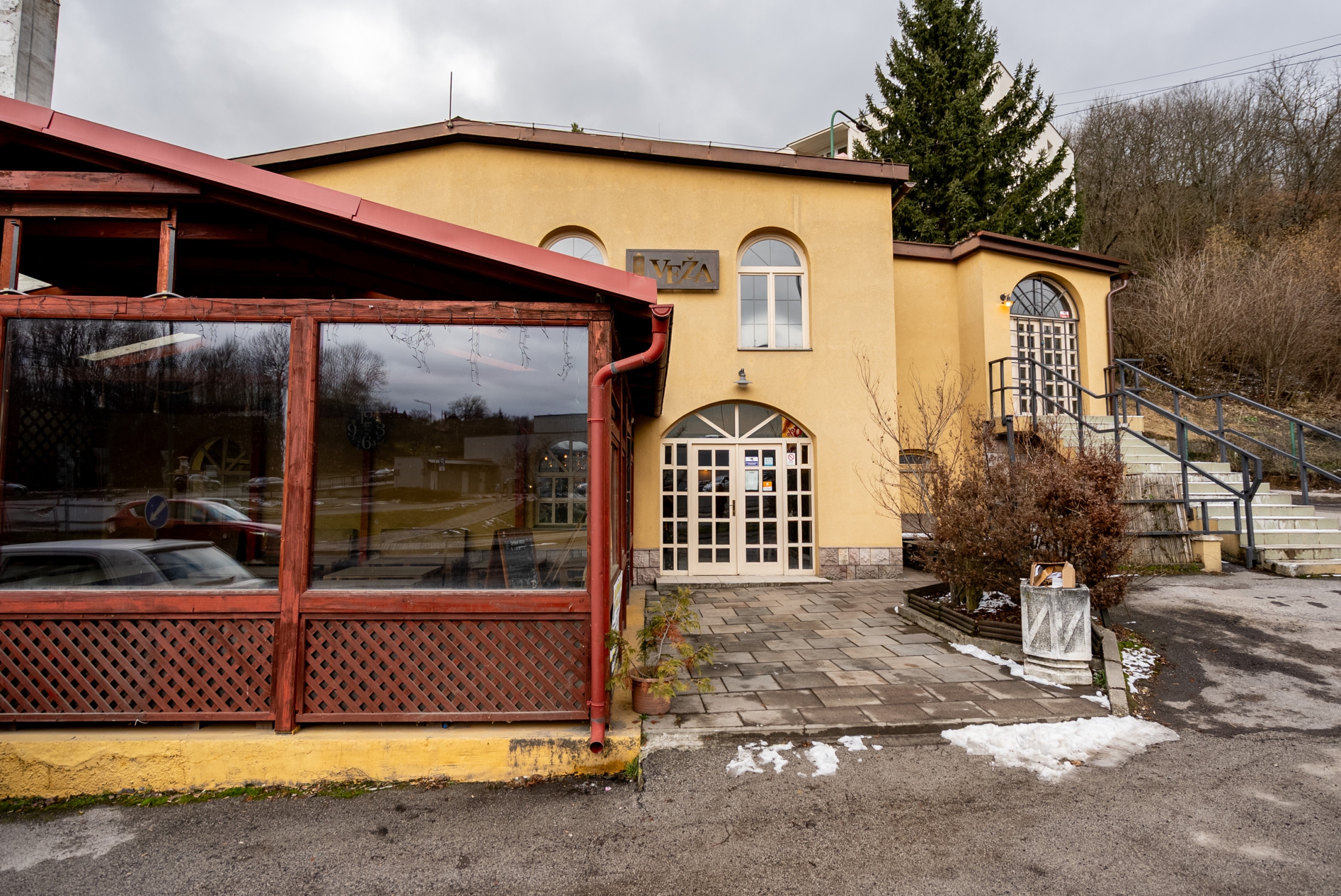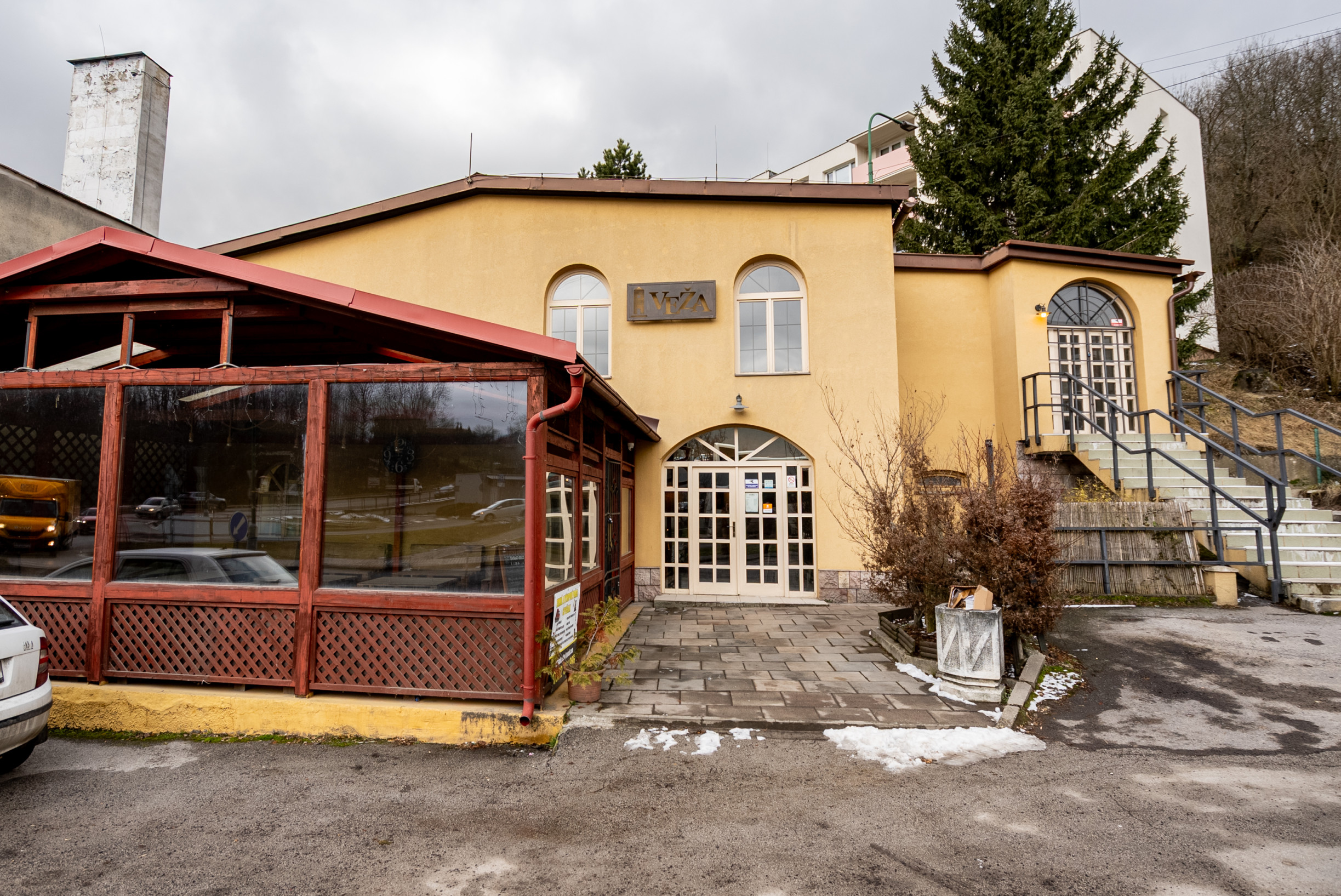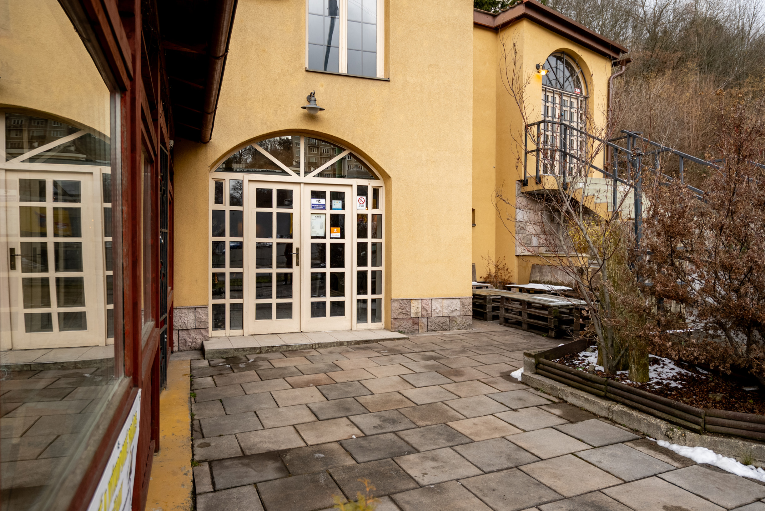 Na poschodie vedie niekoľko vstupov – pre verejnosť z vonkajšej strany po schodisku, vnútorný vstup z kuchynskej časti z prízemia a zadný vstup cez garážové dvere určené najmä pre zásobovanie.