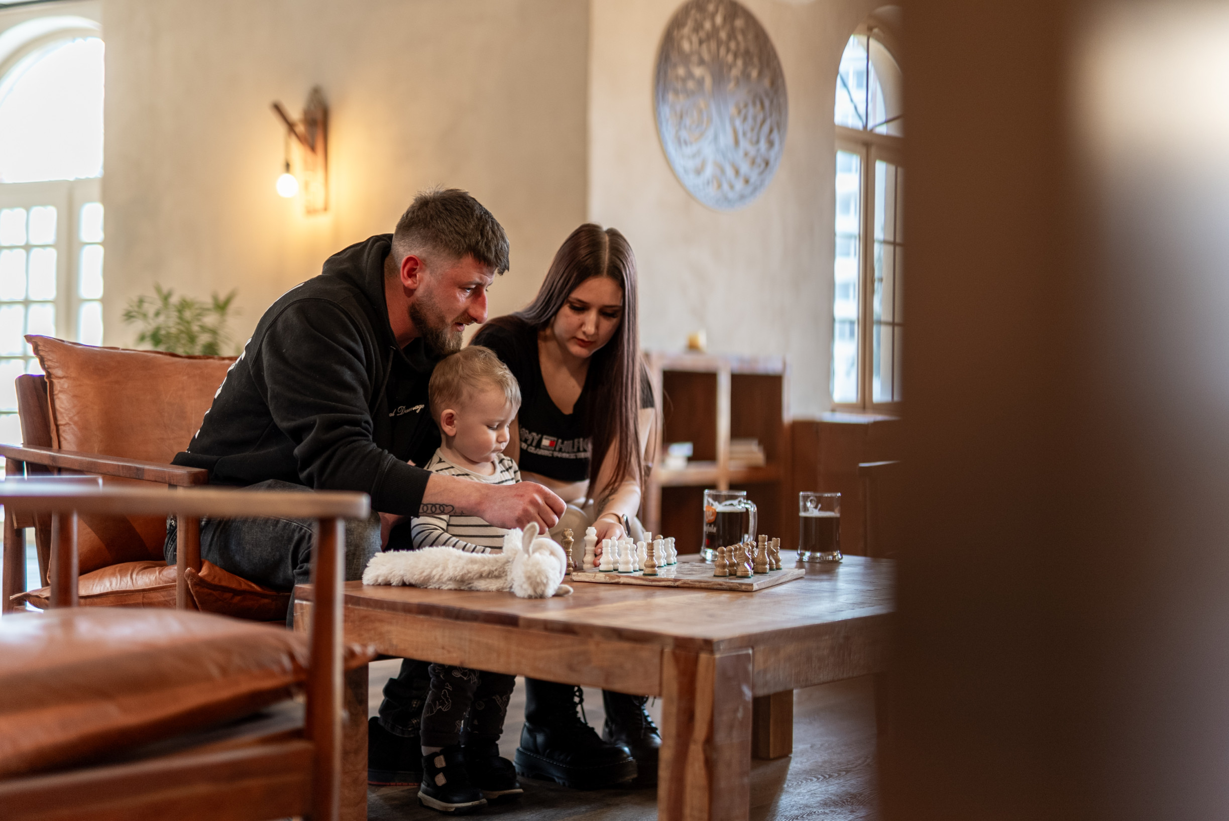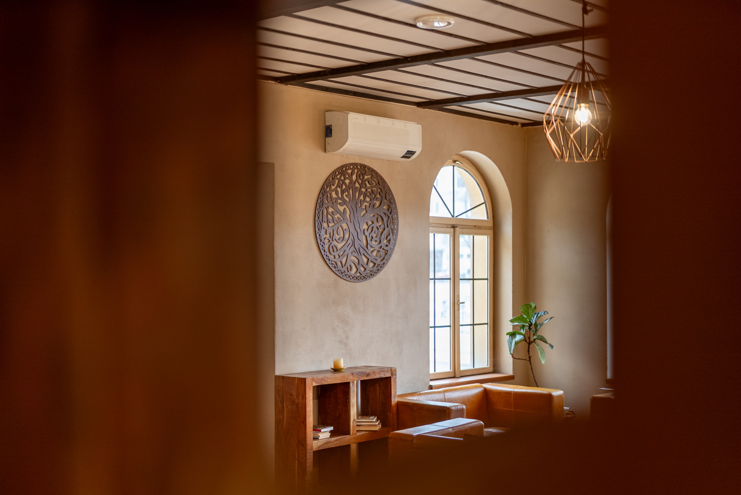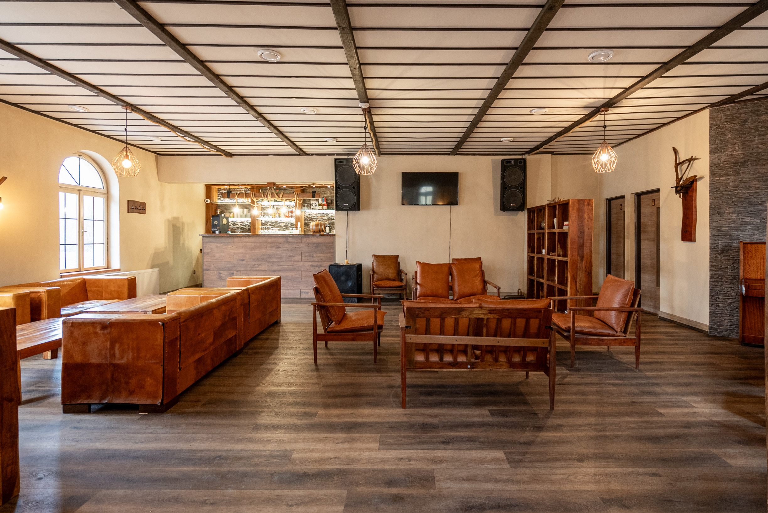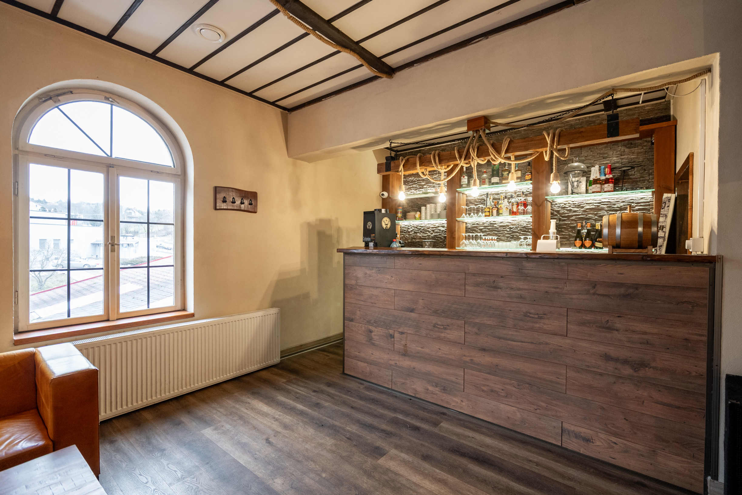 Na poschodie vedie niekoľko vstupov – pre verejnosť z vonkajšej strany po schodisku, vnútorný vstup z kuchynskej časti z prízemia a zadný vstup cez garážové dvere určené najmä pre zásobovanie.