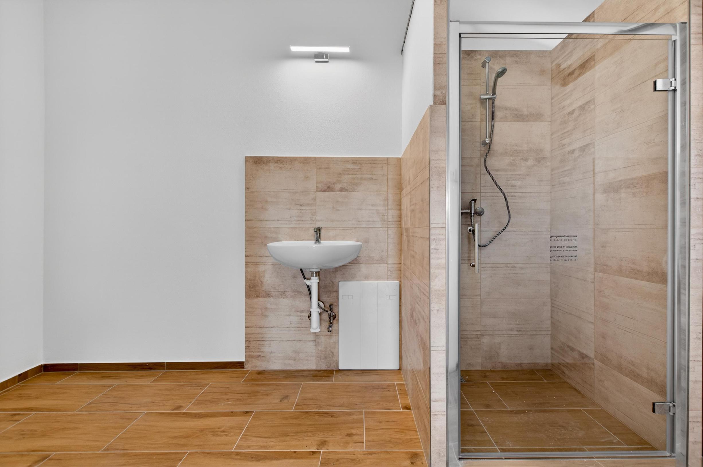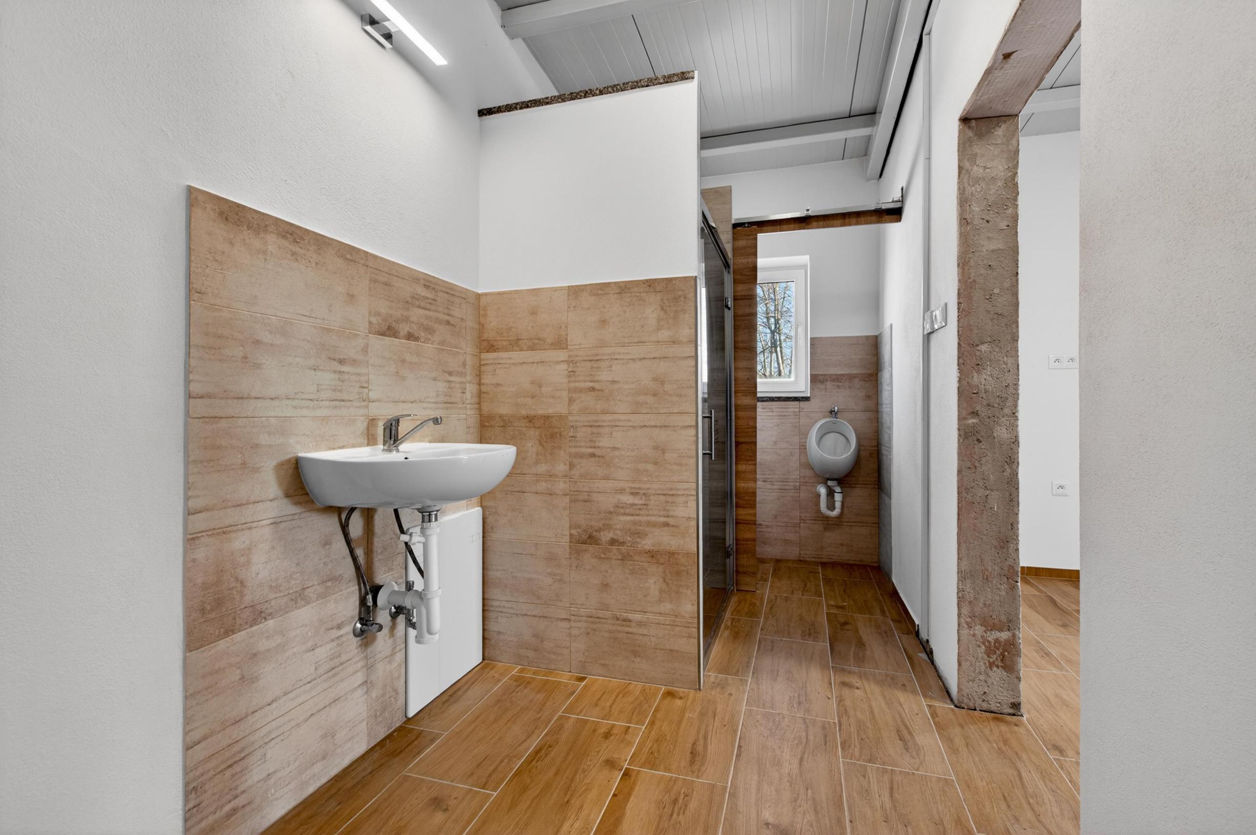 • Hala je prepojená s administratívnou časťou, ktorá poskytuje kompletné zázemie pre zamestnancov: samostatný vstup, kancelársky priestor, WC (vrátane pisoára), sprchový kút, umývadla, keramické podlahy. Administratívna časť je stavebne oddelená od výrobného priestoru.