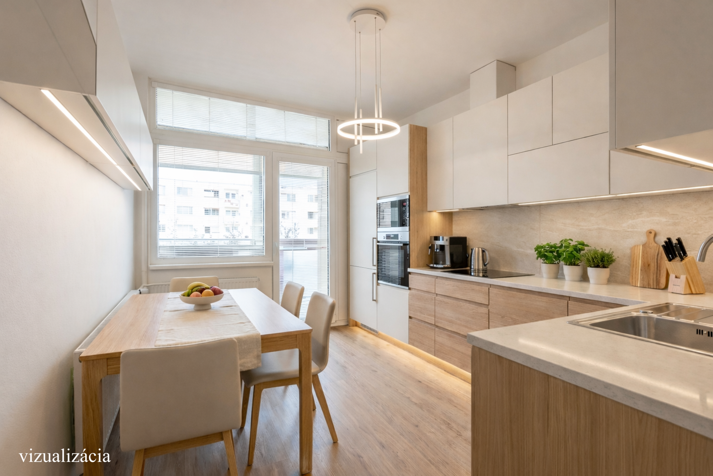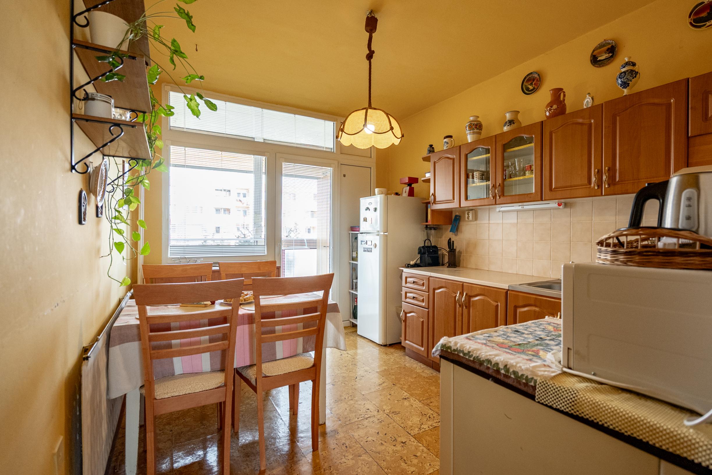 Na konci chodby sa nachádza kuchyňa s výstupom na loggiu orientovanú na severovýchod, ktorá poskytuje príjemné ranné svetlo a môže slúžiť ako pokojné miesto na rannú kávu alebo oddych.