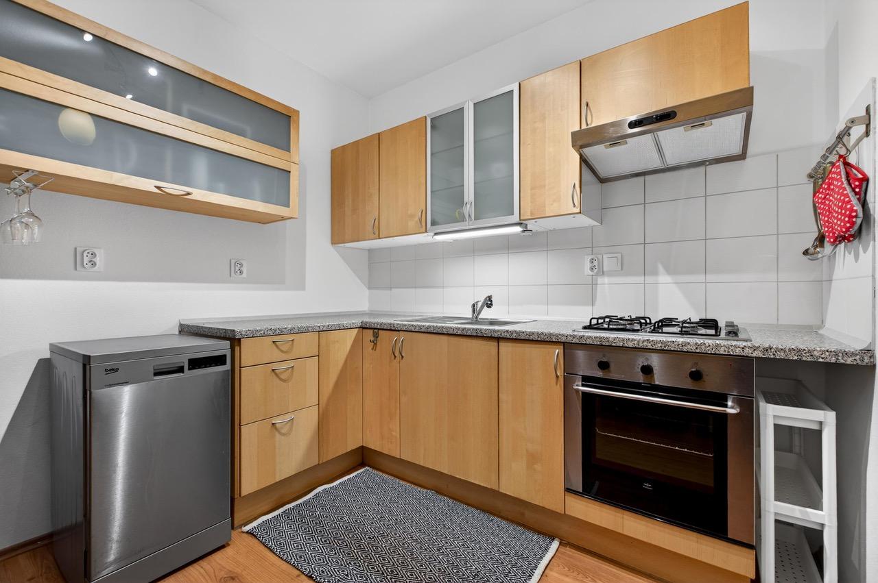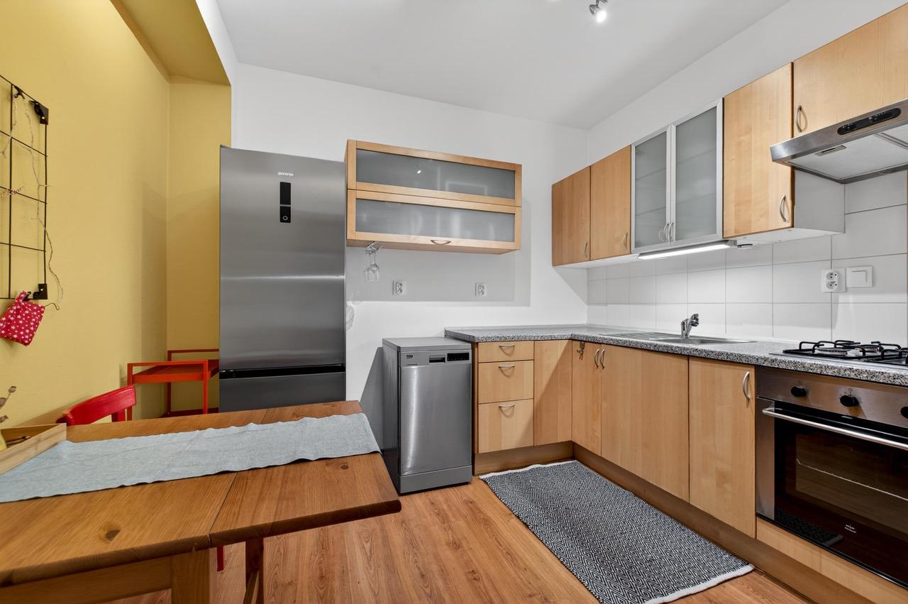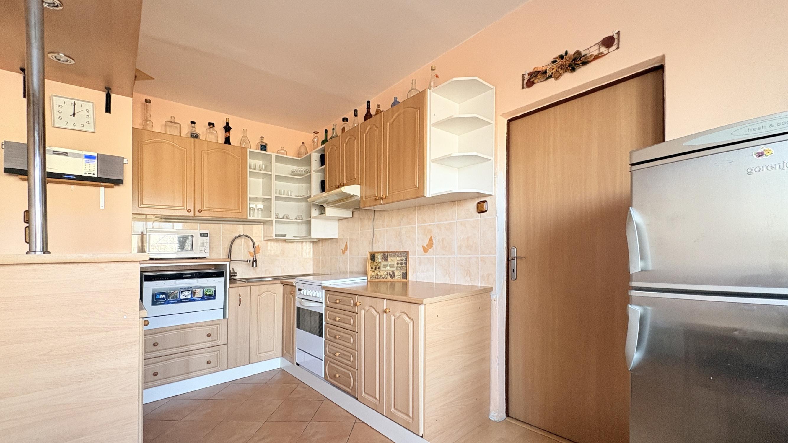 - Kuchyňa - kuchynská linka so spotrebičmi, samostatne stojaca chladnička s mraz-ničkou, umývačka riadu, stôl s dvomi stoličkami