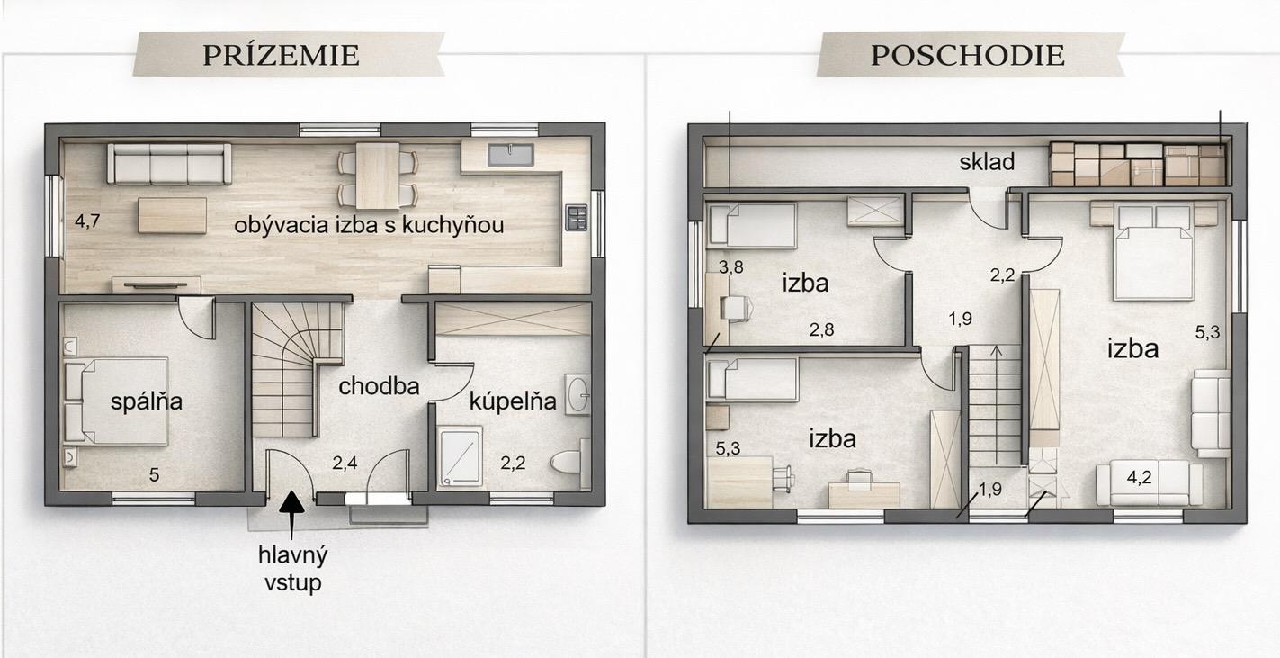• Parkovanie: vlastný pozemok (3–4 autá)