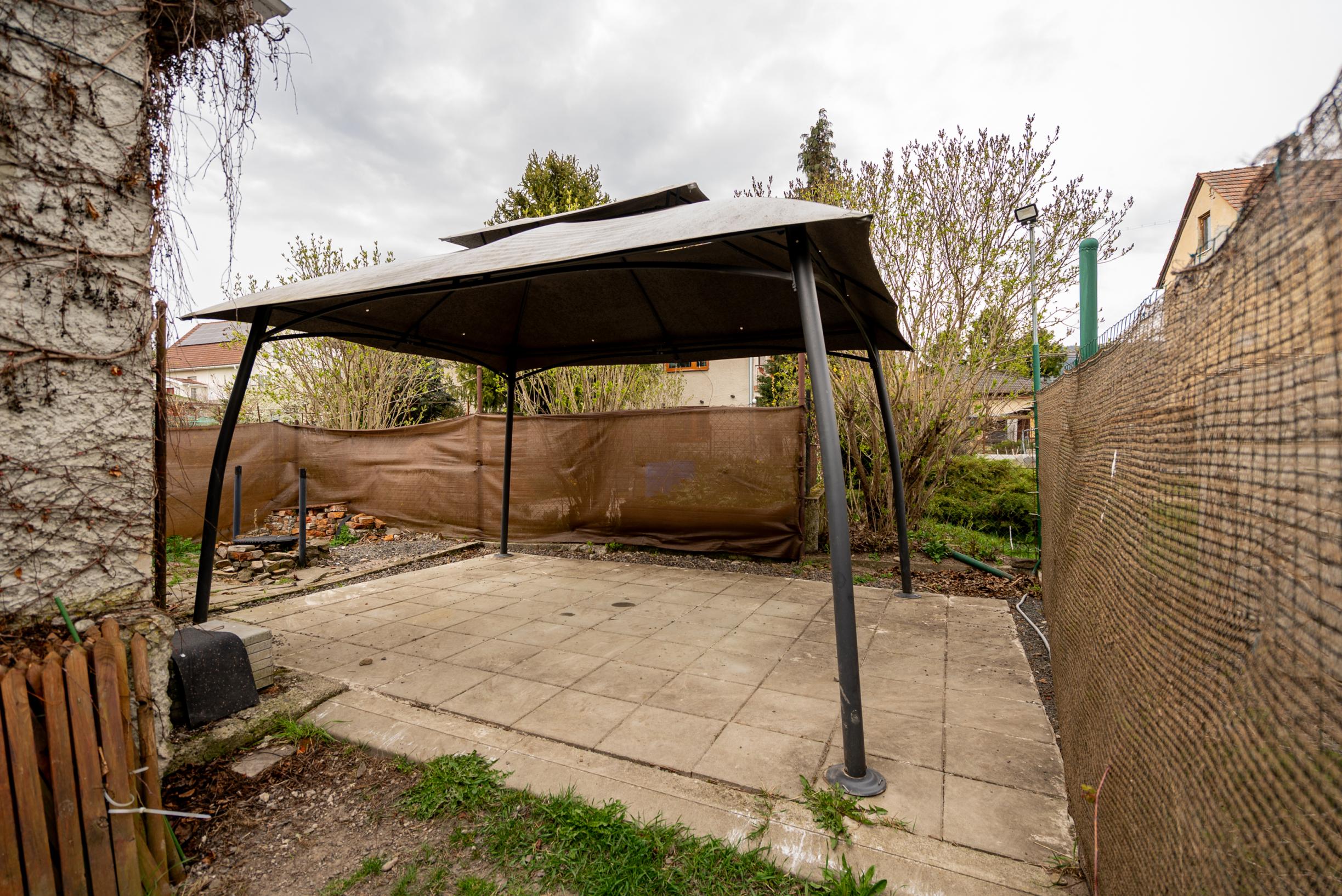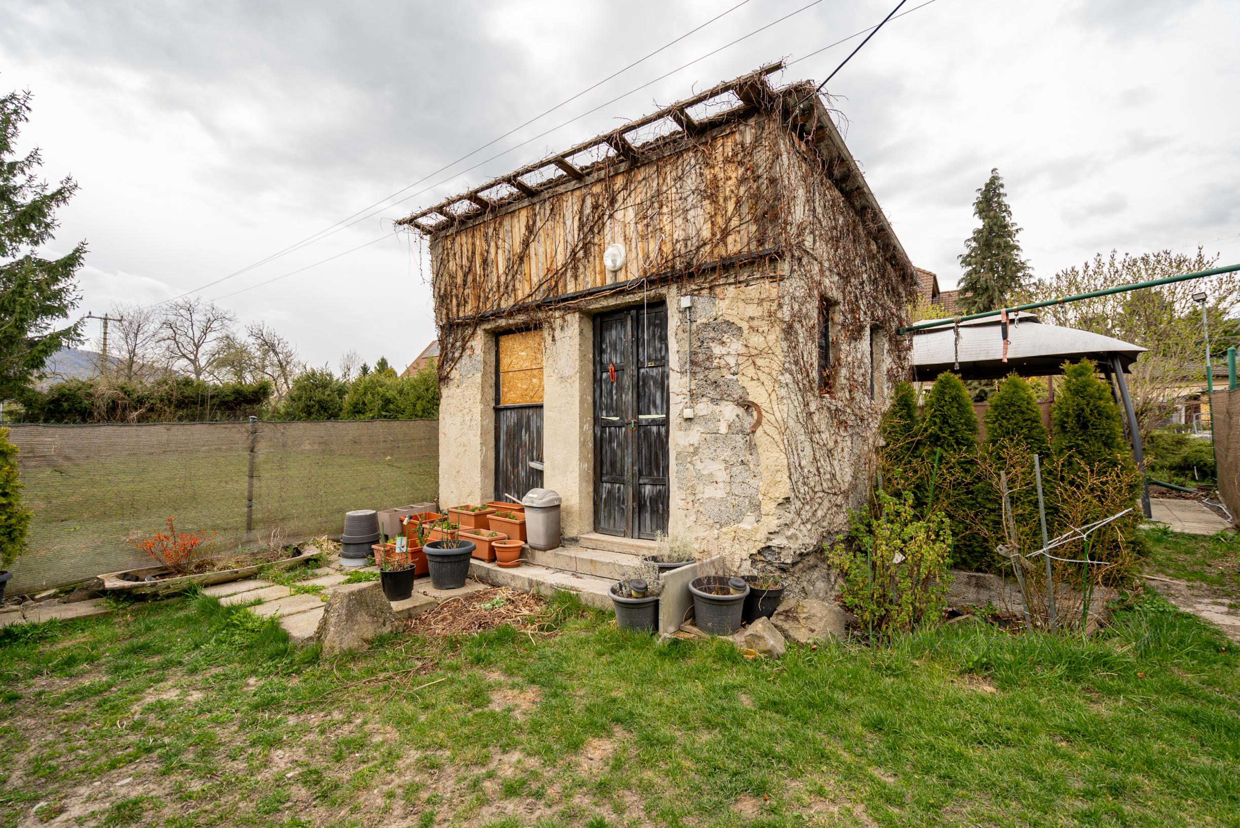 K bytu prislúcha záhrada o výmere cca 300 m² s altánkom a záhradným domčekom napojeným na elektriku. Pozemok je oplotený a prístupný z obecnej cesty, čo umožňuje aj pohodlné parkovanie.