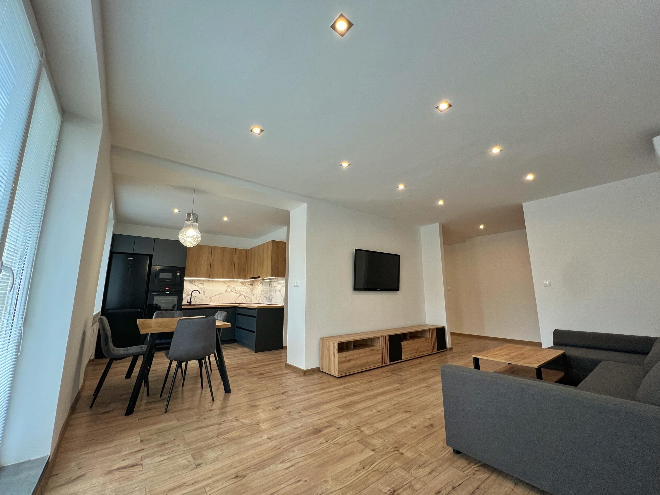 - moderná dispozícia bytu, v ktorom je obývačka prepojená s kuchyňou