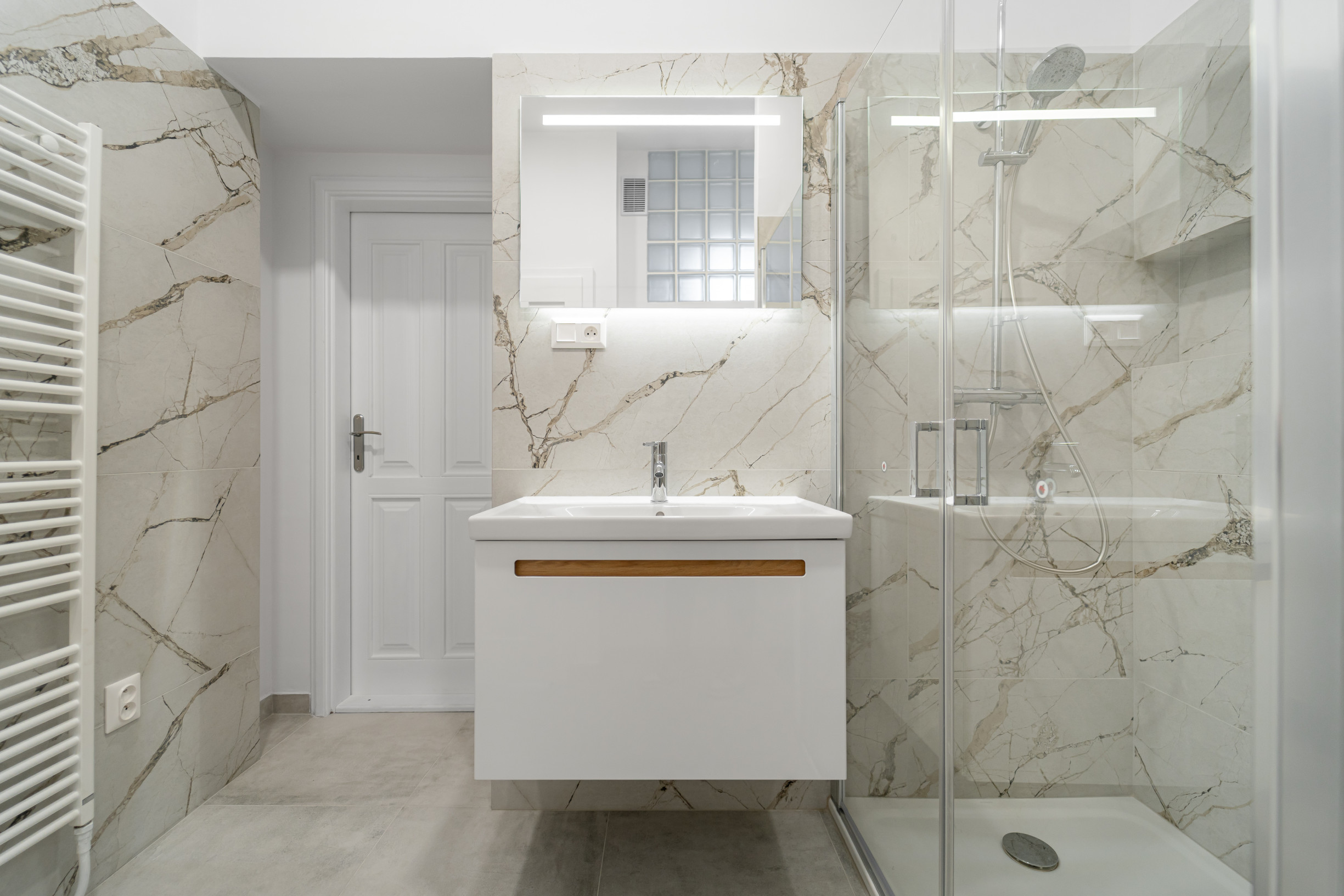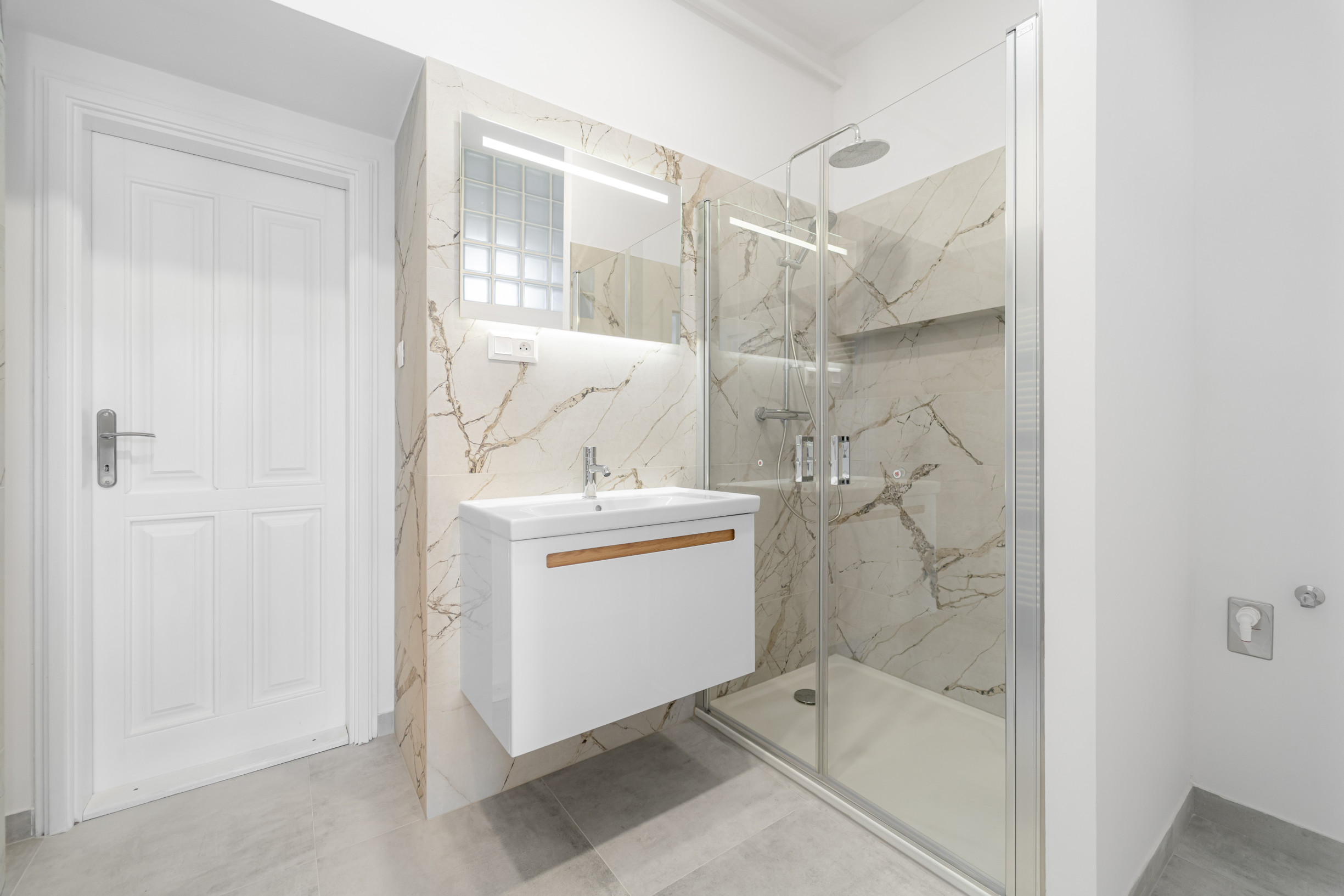 * nová priestranná kúpeľňa so sprchovacím kútom, príprava na práčku a sušičku