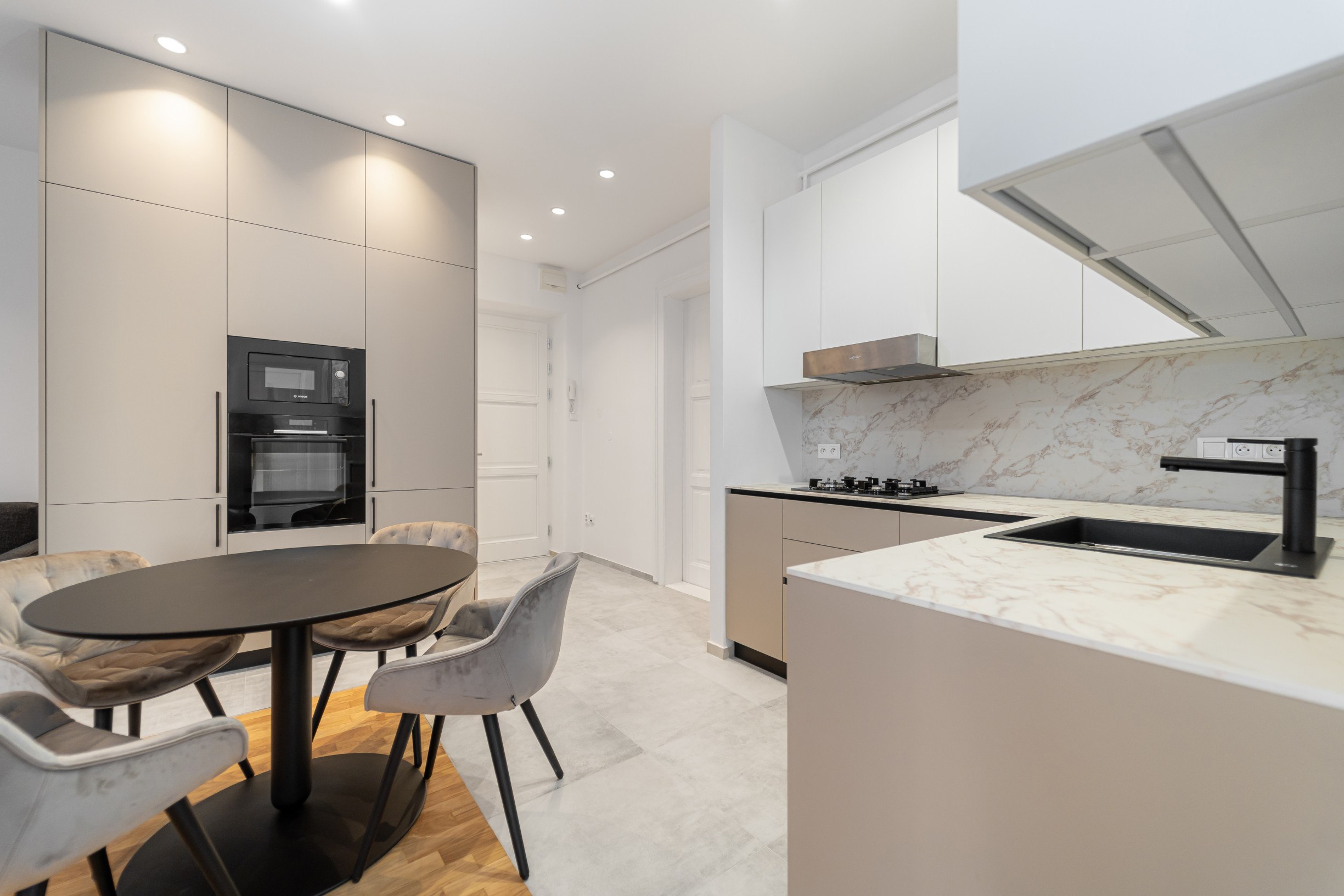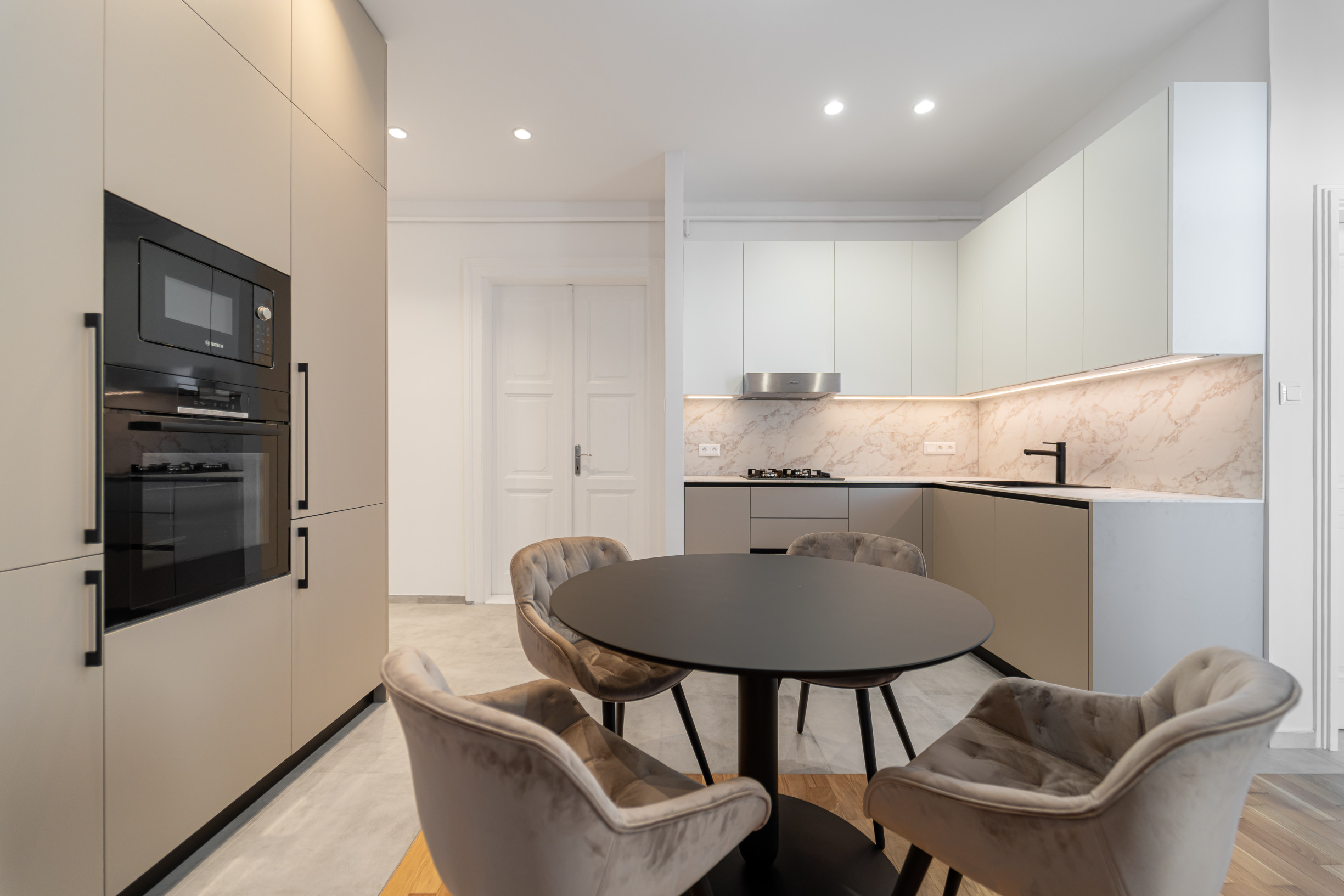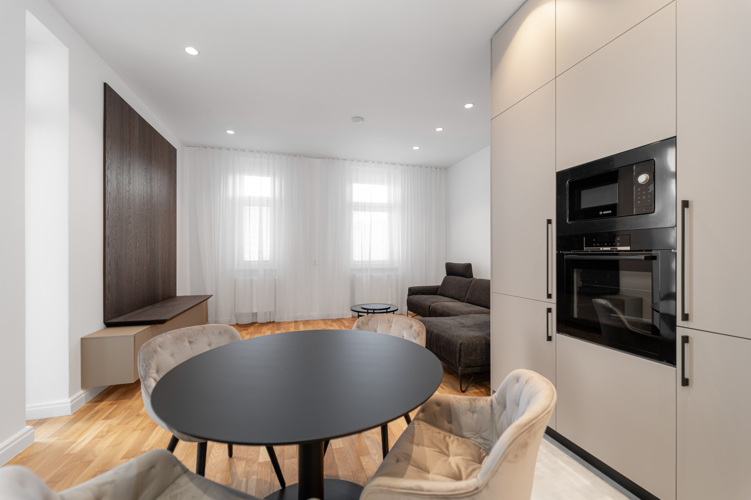 * moderná kuchynská linka so spotrebičmi s jedálenskou časťou