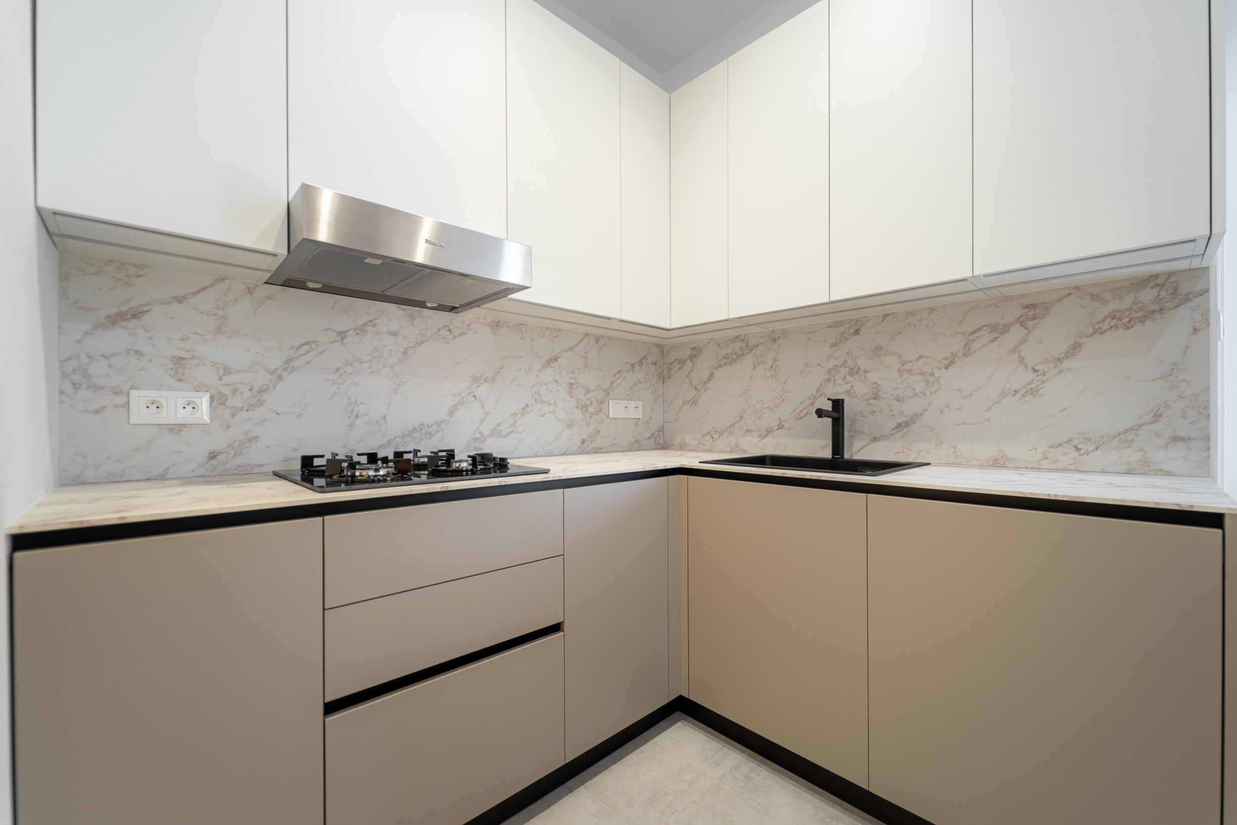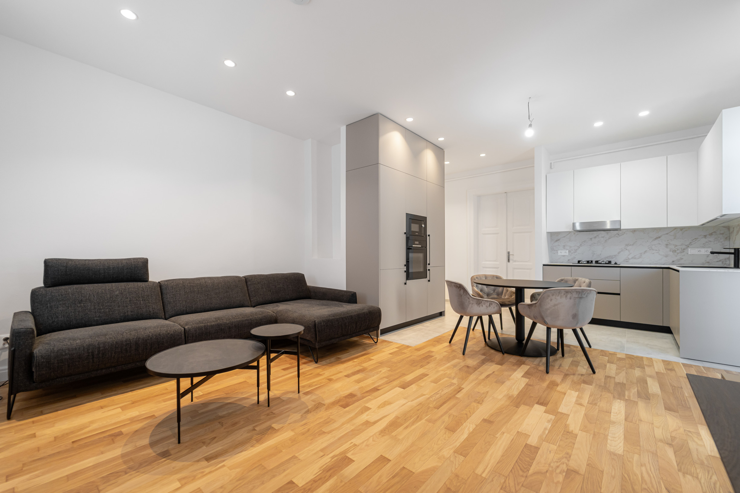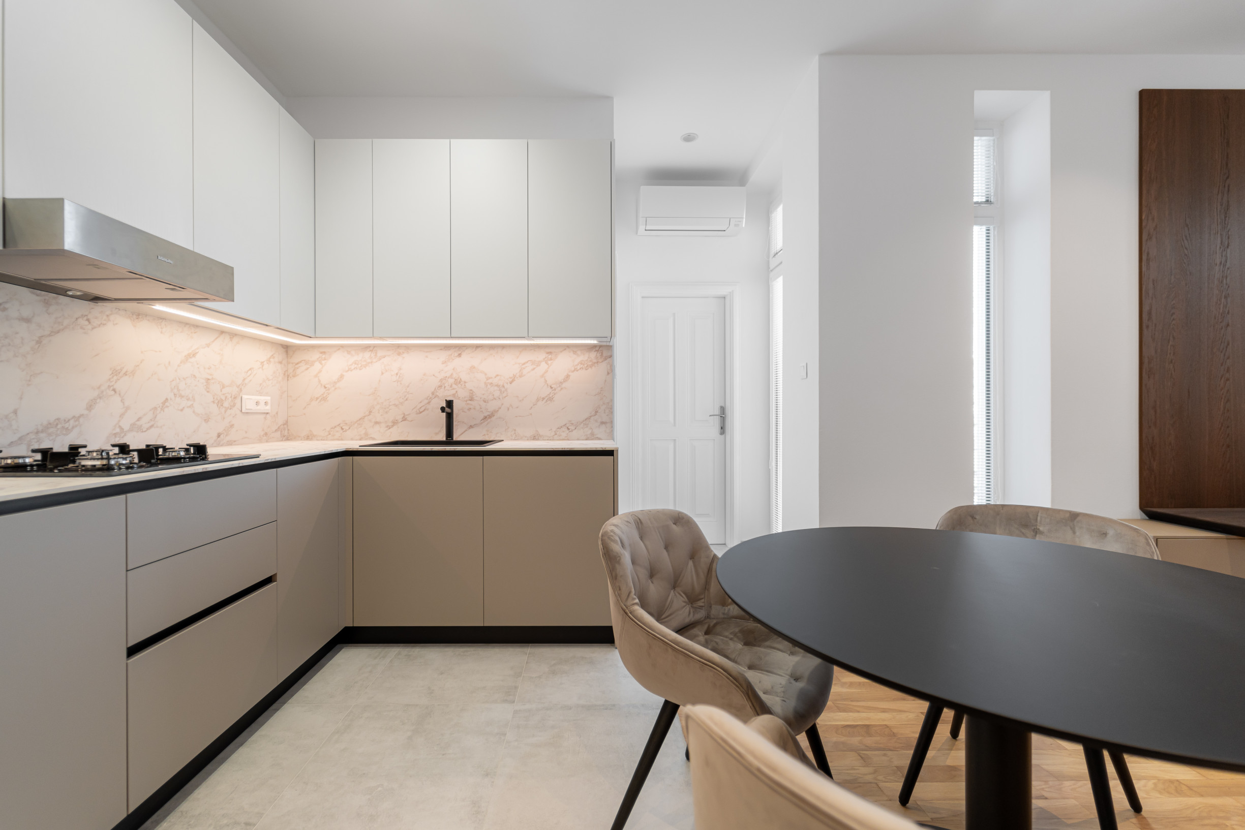 * moderná kuchynská linka so spotrebičmi s jedálenskou časťou