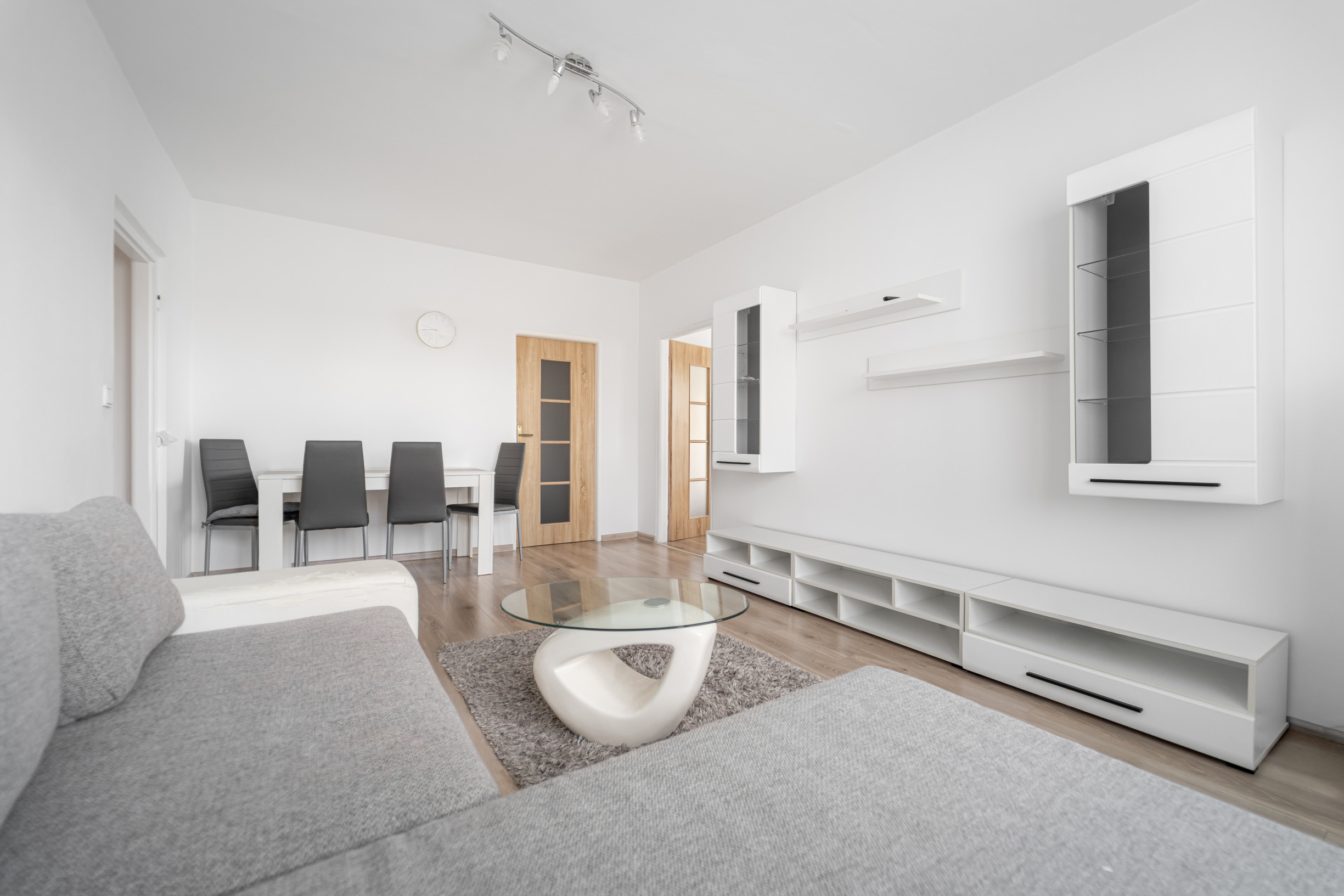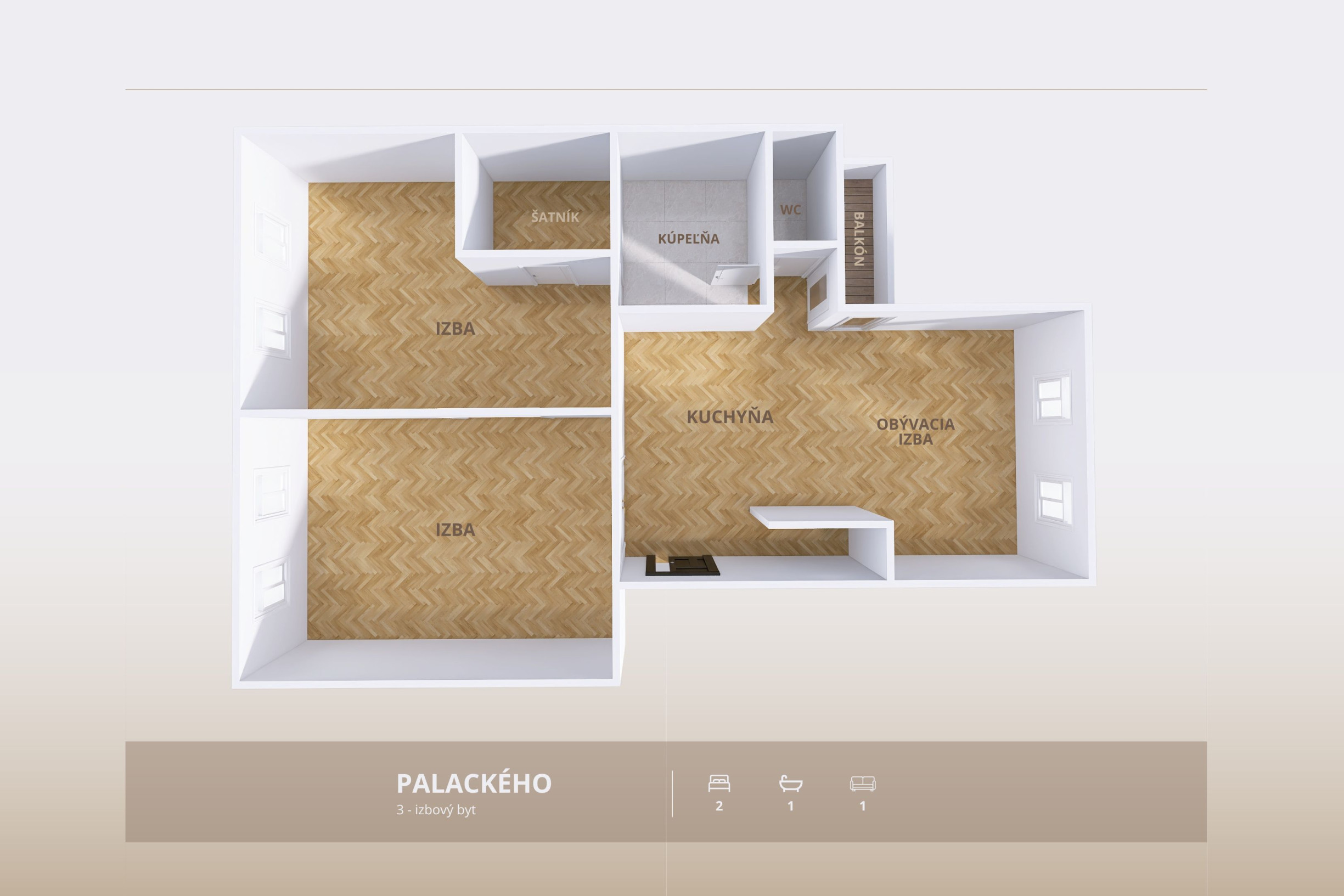 * vstupná chodba, obývacia izba spojená s kuchyňou, 2x izba, šatník, kúpeľňa, WC, balkón, pivnica
