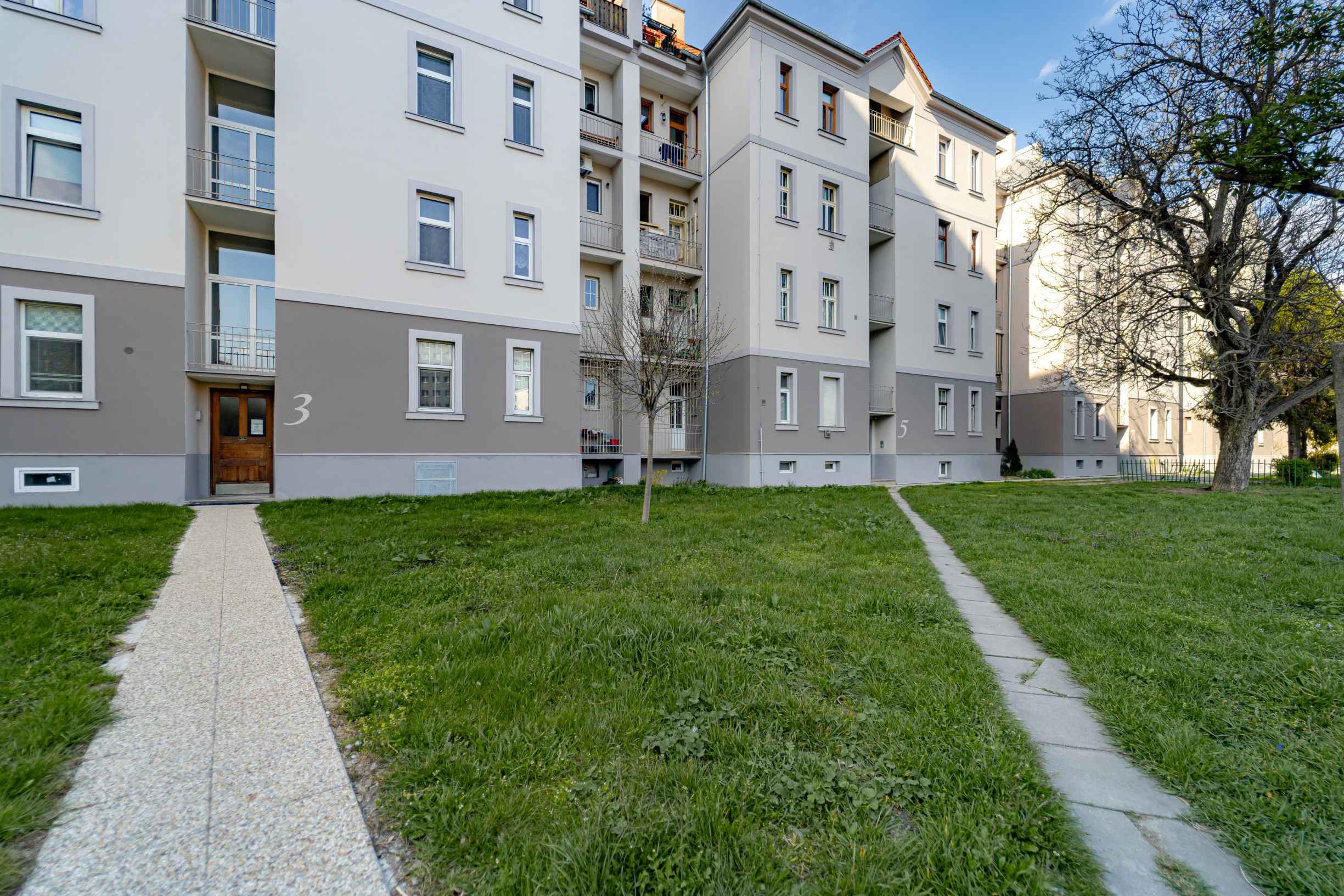 * tehlový bytový dom s novou fasádou
