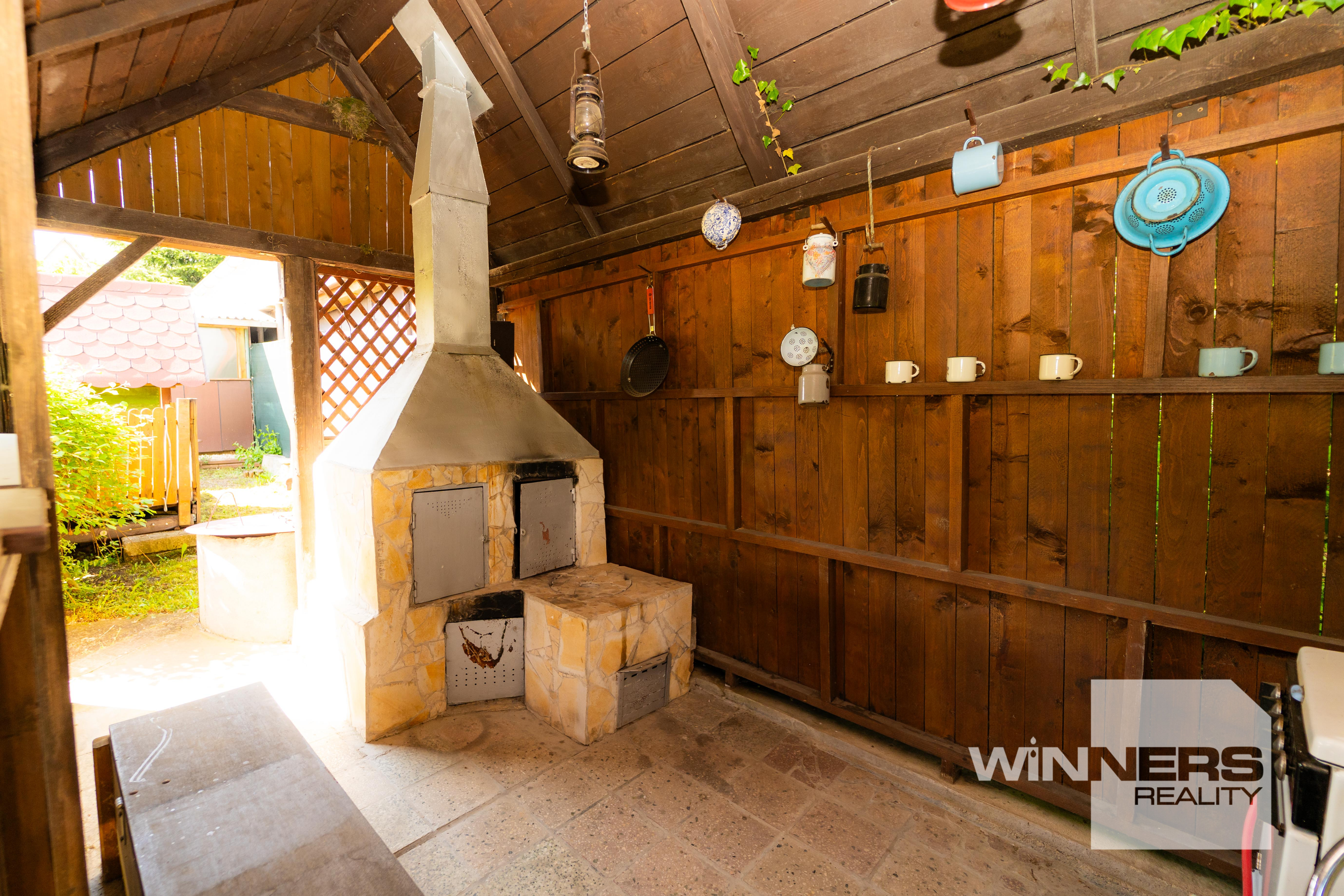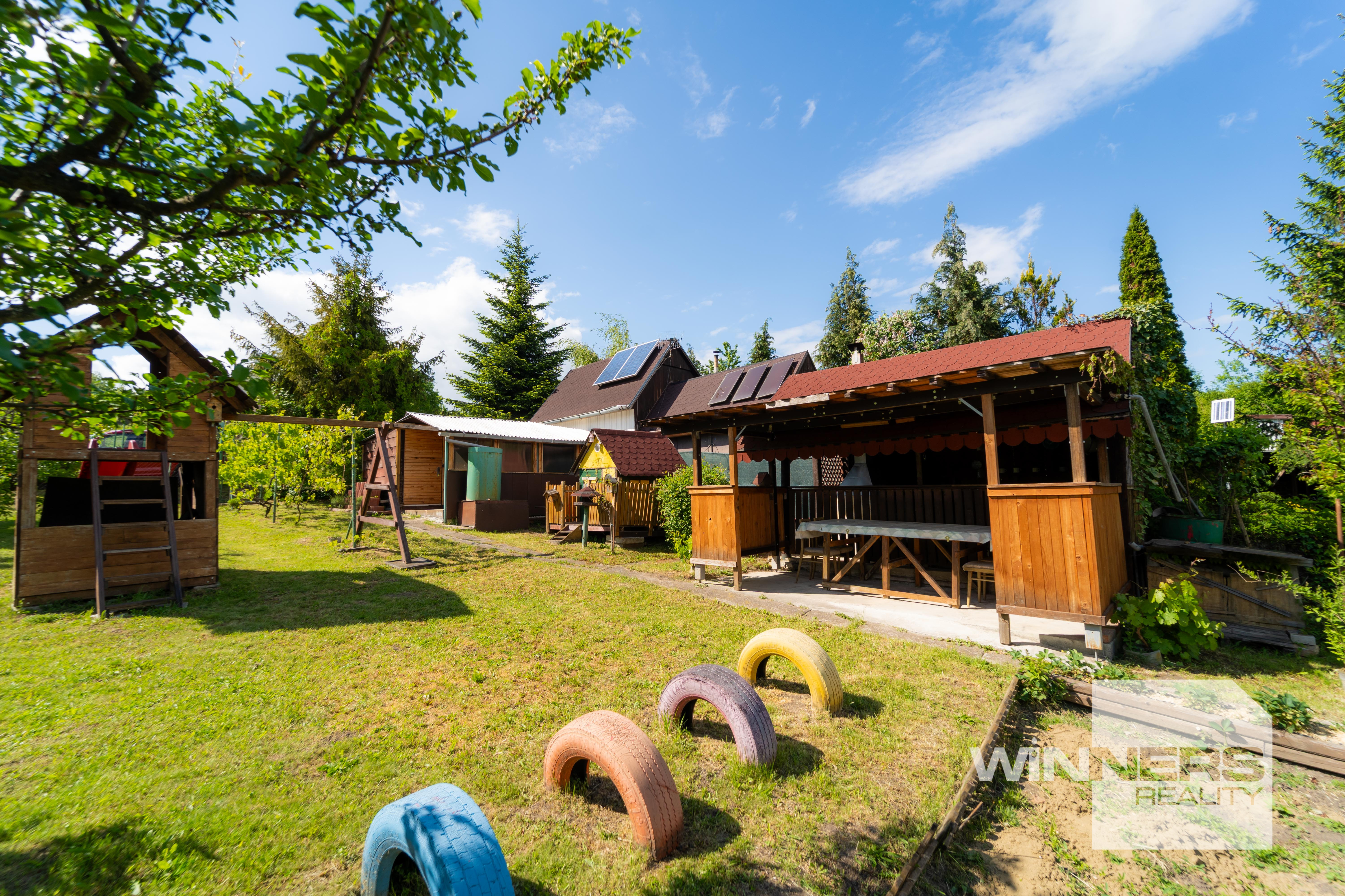 • Drevený altánok s murovaným grilom • Udiareň • 2 záhradné domčeky pre detičky • Časť pozemku je určená na sadenie zeleniny, časť je zatrávnená
