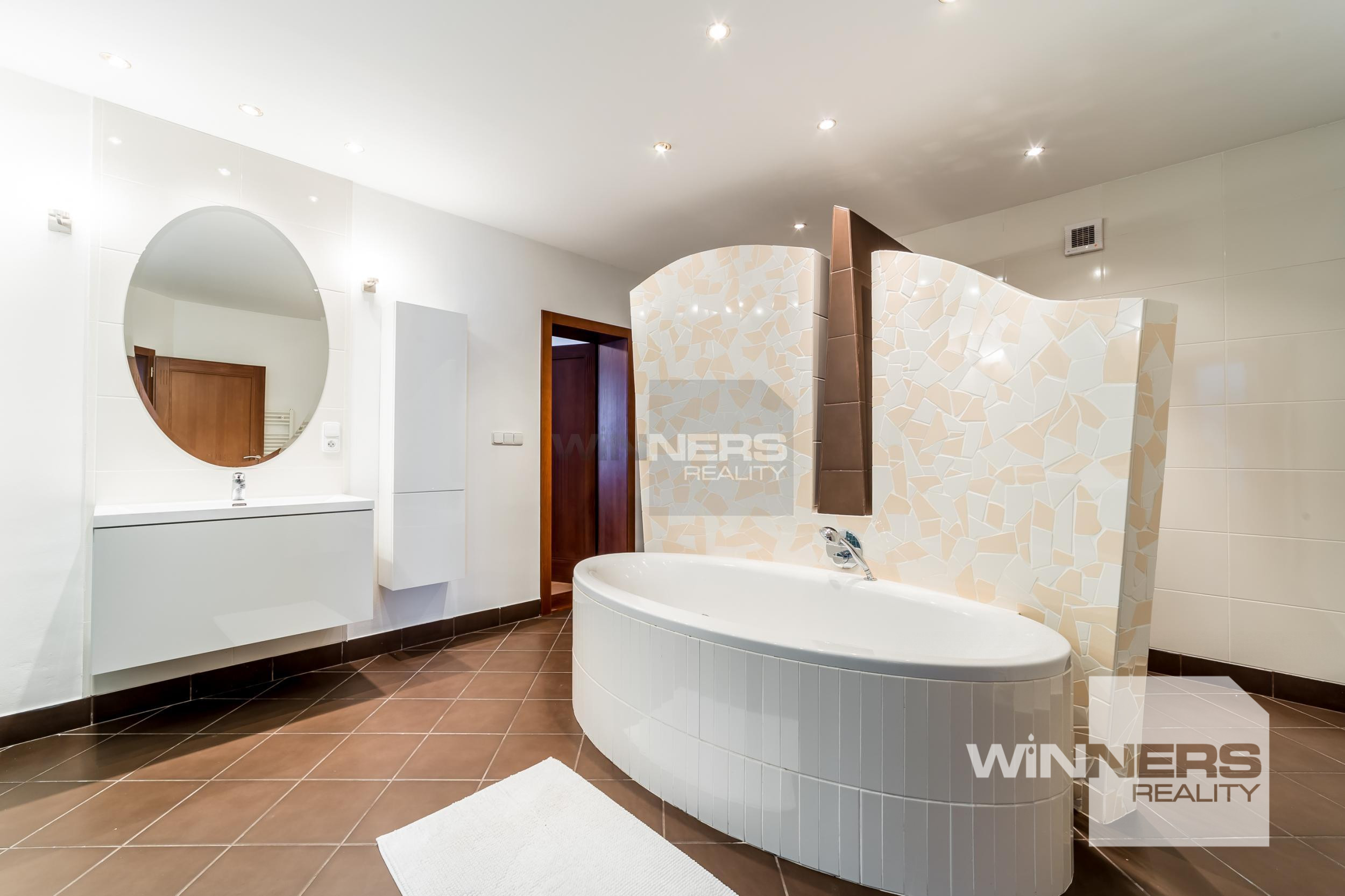 • Kúpeľňa je zaujímavo archektonicky navrhnutá, prepojená so spálňou a zároveň má vstup z chodby