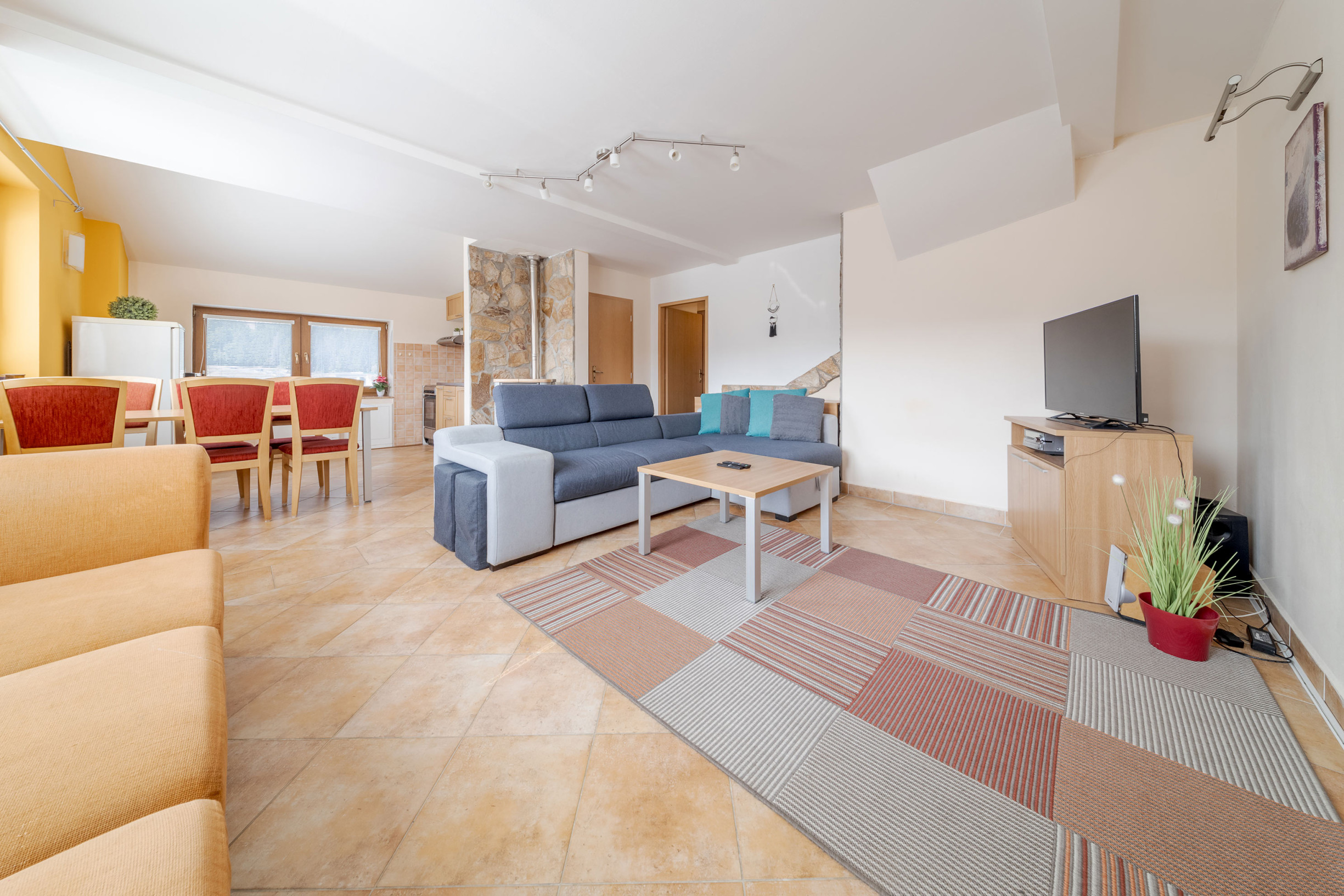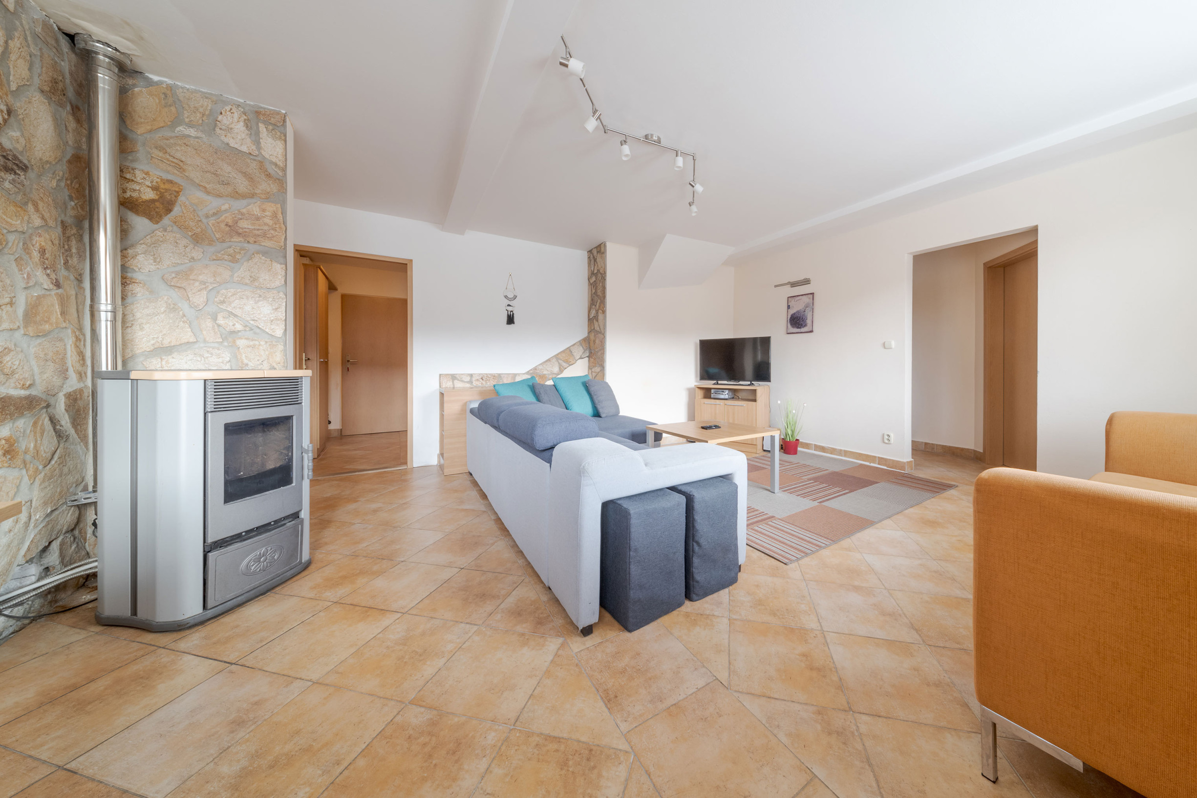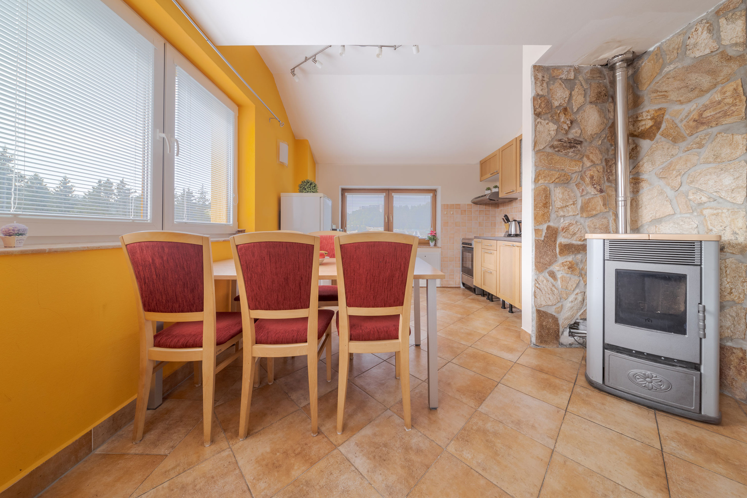 • Vykurovanie: elektrické radiátory a krbová kachle na pelety ( flek na strope je z čias pred výmenou strechy v roku 2019 )