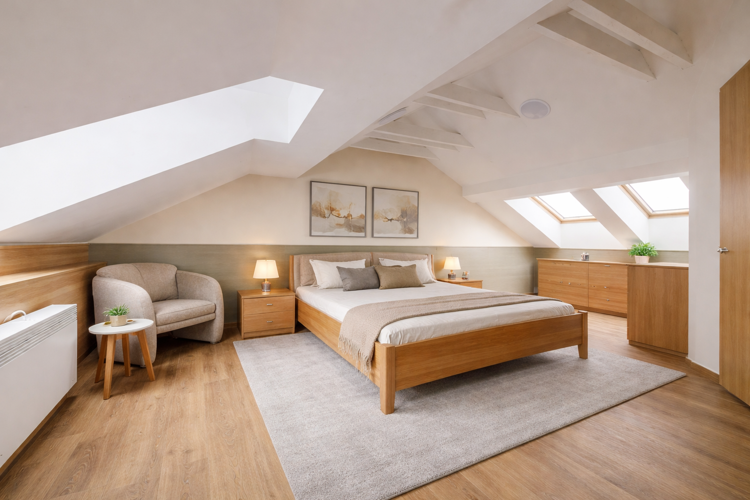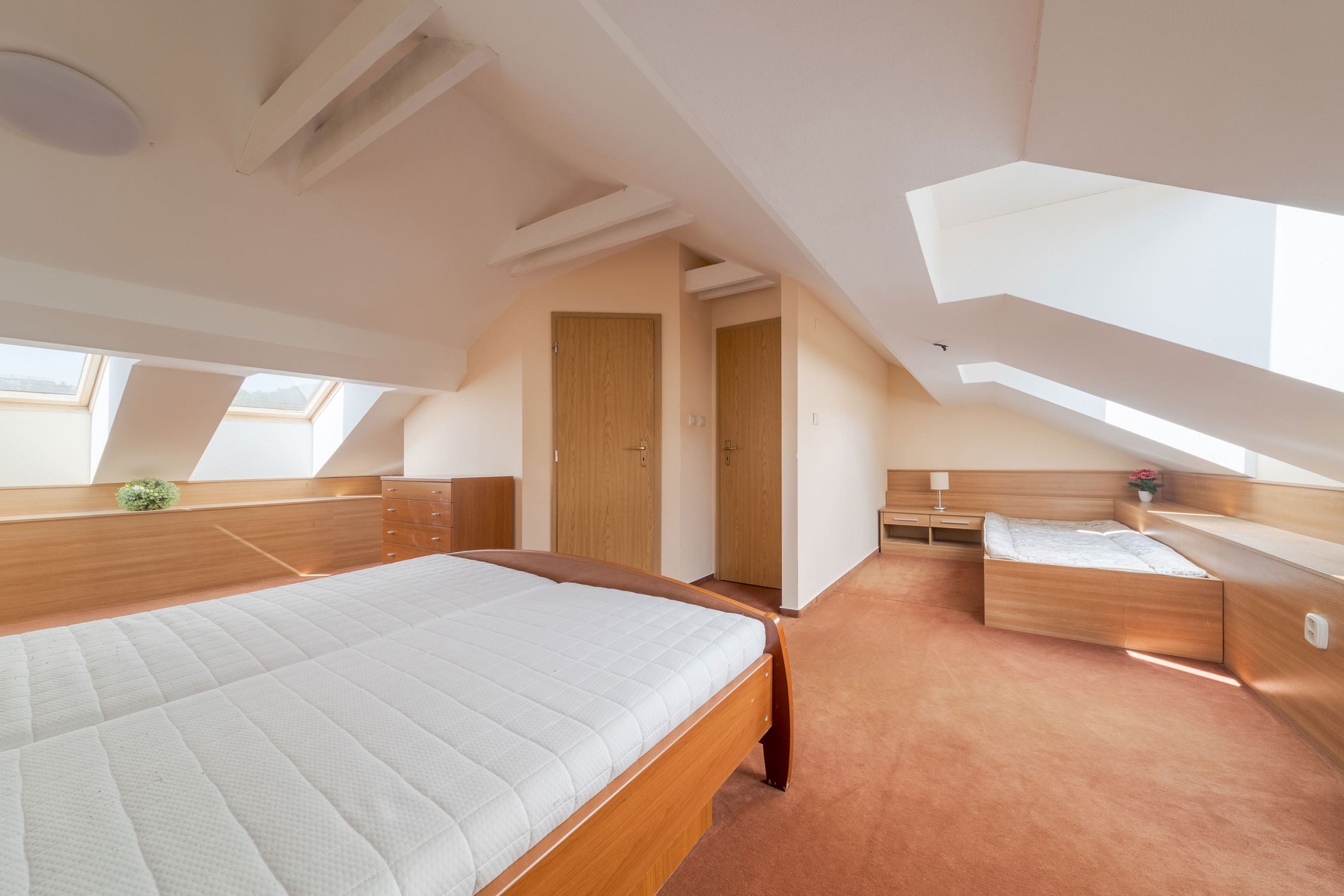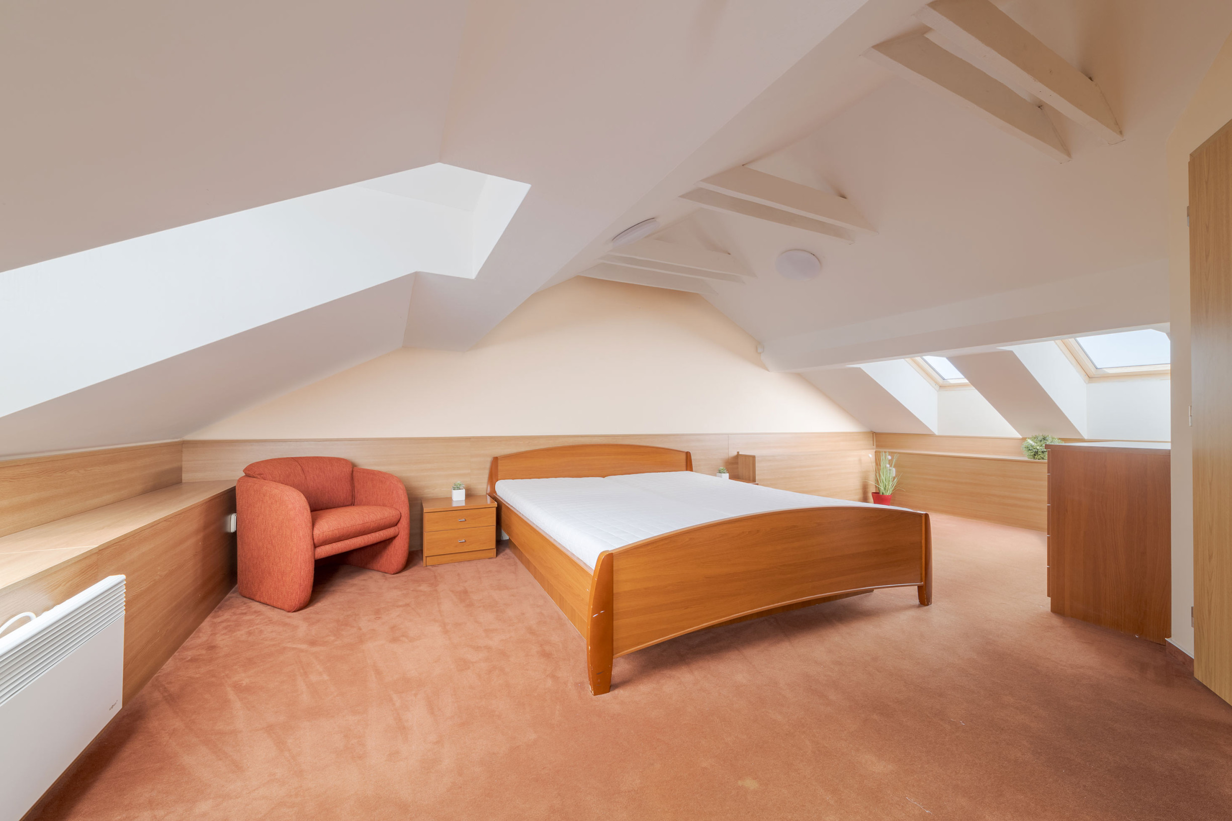 • Vykurovanie: elektrické radiátory a krbová kachle na pelety ( flek na strope je z čias pred výmenou strechy v roku 2019 )