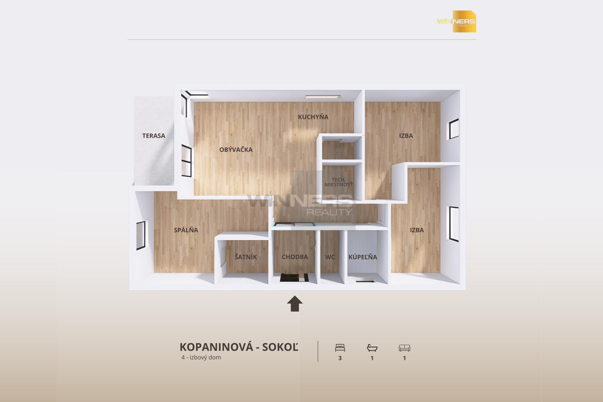 Legenda miestností - kuchyňa + obývacia izba (33,50 m2), spálňa so šatníkom (16,70 m2) + kúpeľňa s WC (3,95 m2), izba (15,30 m2), izba (13,10 m2), kúpeľňa s WC (3,90 m2), chodba (3,15 m2), zádverie (4,90 m2), tech. miestnosť (2,90 m2), terasa (25,50 m2),