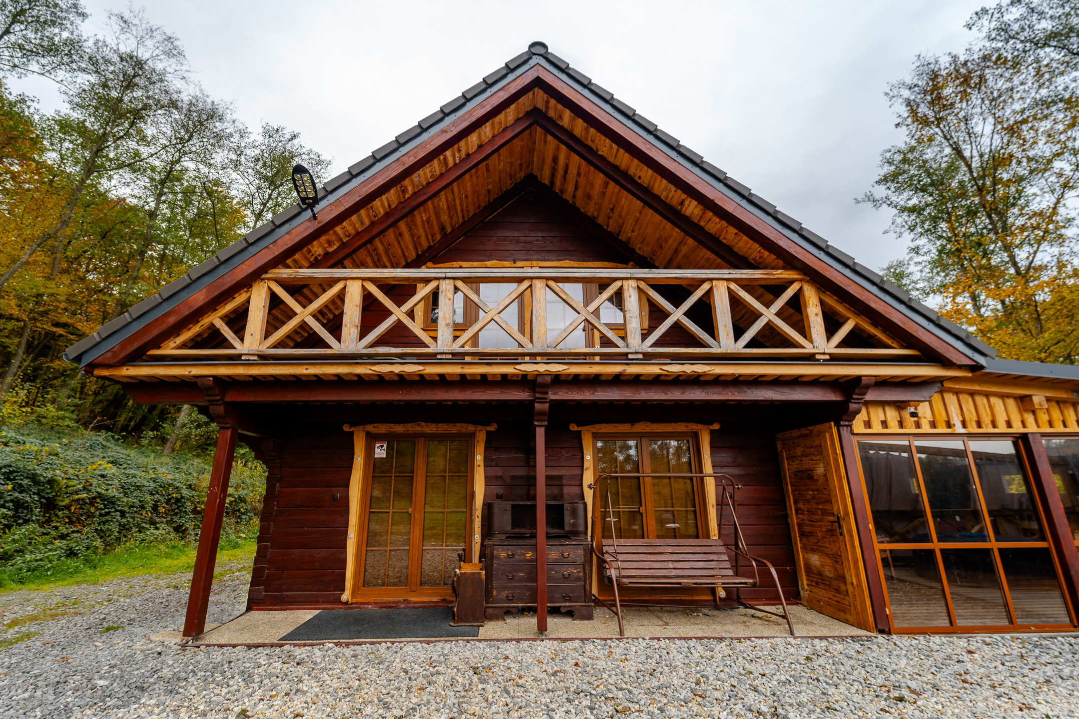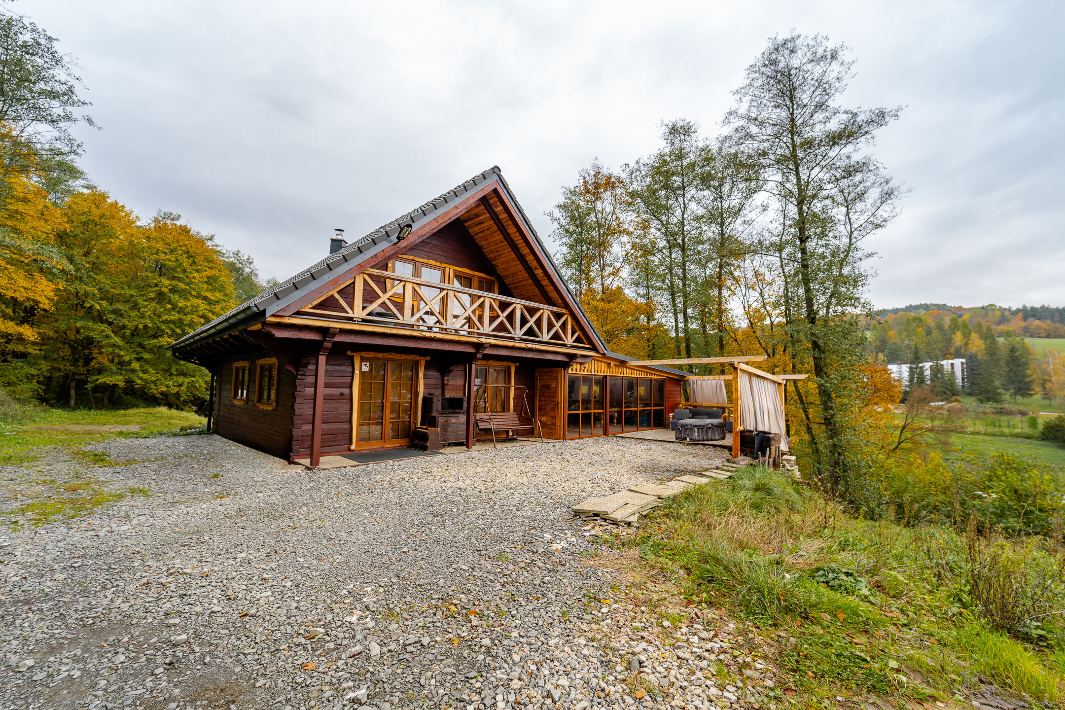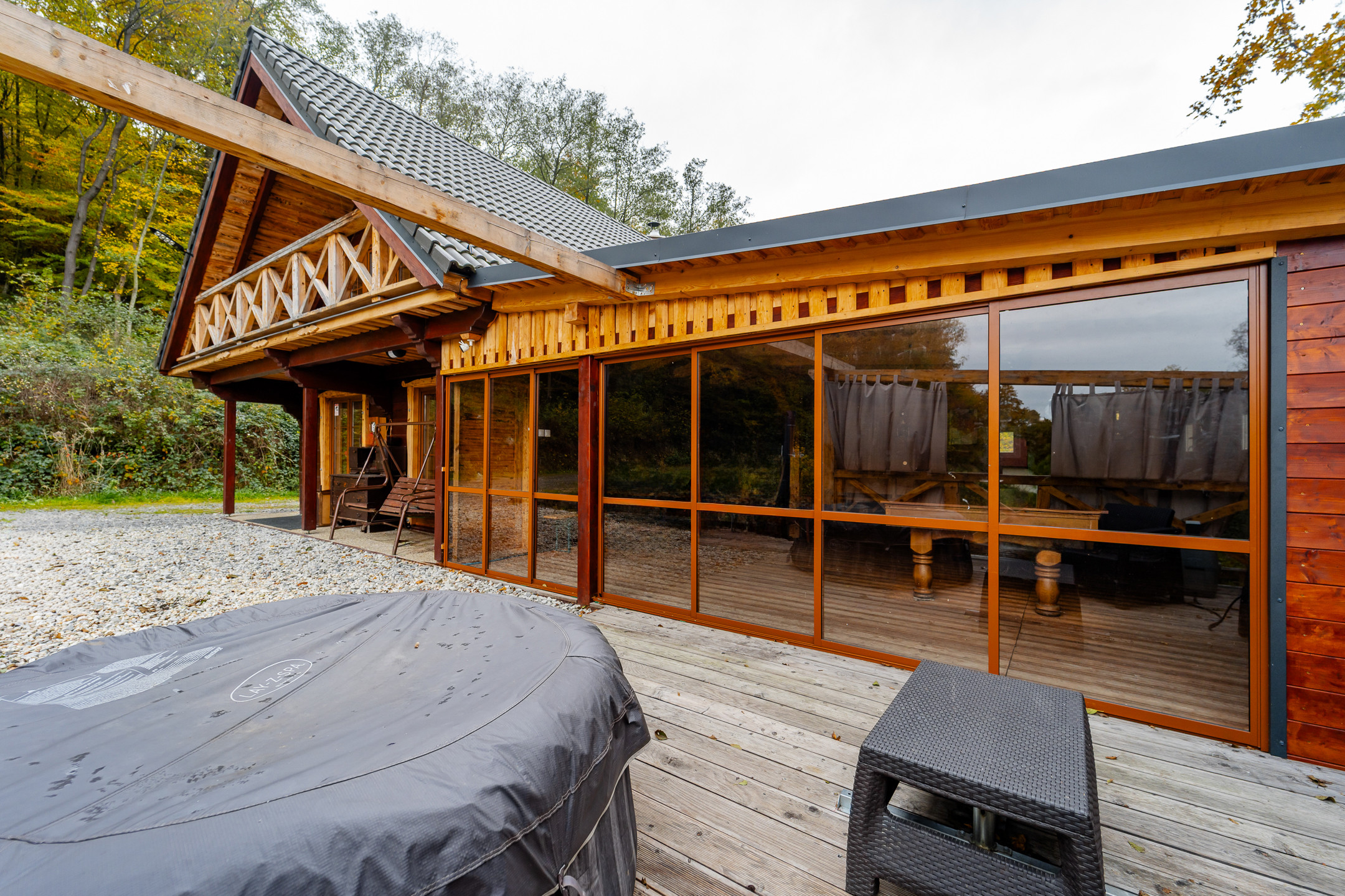 Popis domu: chata má na prízemí veľkú obývaciu izbu s jedálňou a kuchyňou, 1x spálňa, kúpeľňa s vaňou a samostatná toaleta. Na poschodí sa nachádzajú 4 spálne. Z vonkajšej časti sa vstupuje do spoločenskej miestnosti – tkzv.herne, ktorá je dokonalým miestom pre usporiadanie večierkov pre priateľov. K tejto miestnosti prislúcha priestranná terasa s vonakjším ratanovým sedením, záhradným grilom a vírivkou. V suteréne je sauna, vinotéka a garaž.