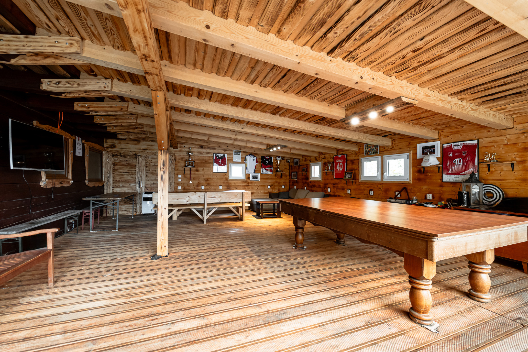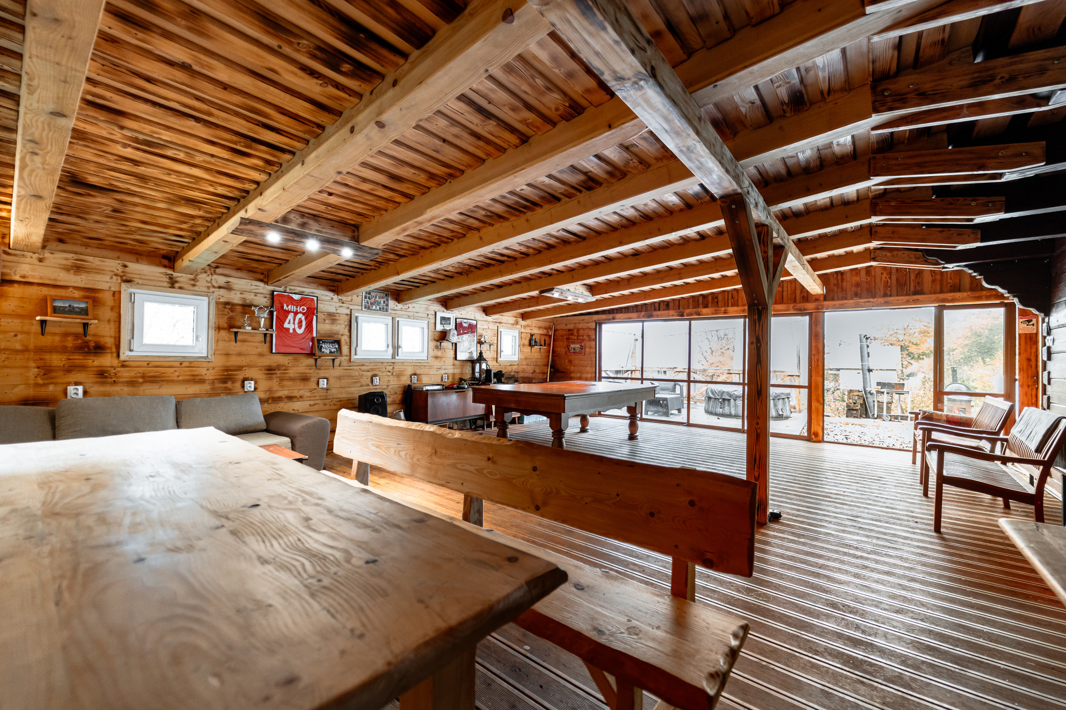 - Výhodou je naozaj veľkorysá spoločenská miestnosť s biliardovým stolom. Ku ktorej prislúcha terasa vybavená ratanovým sedením, vírivou vaňou a grilom.