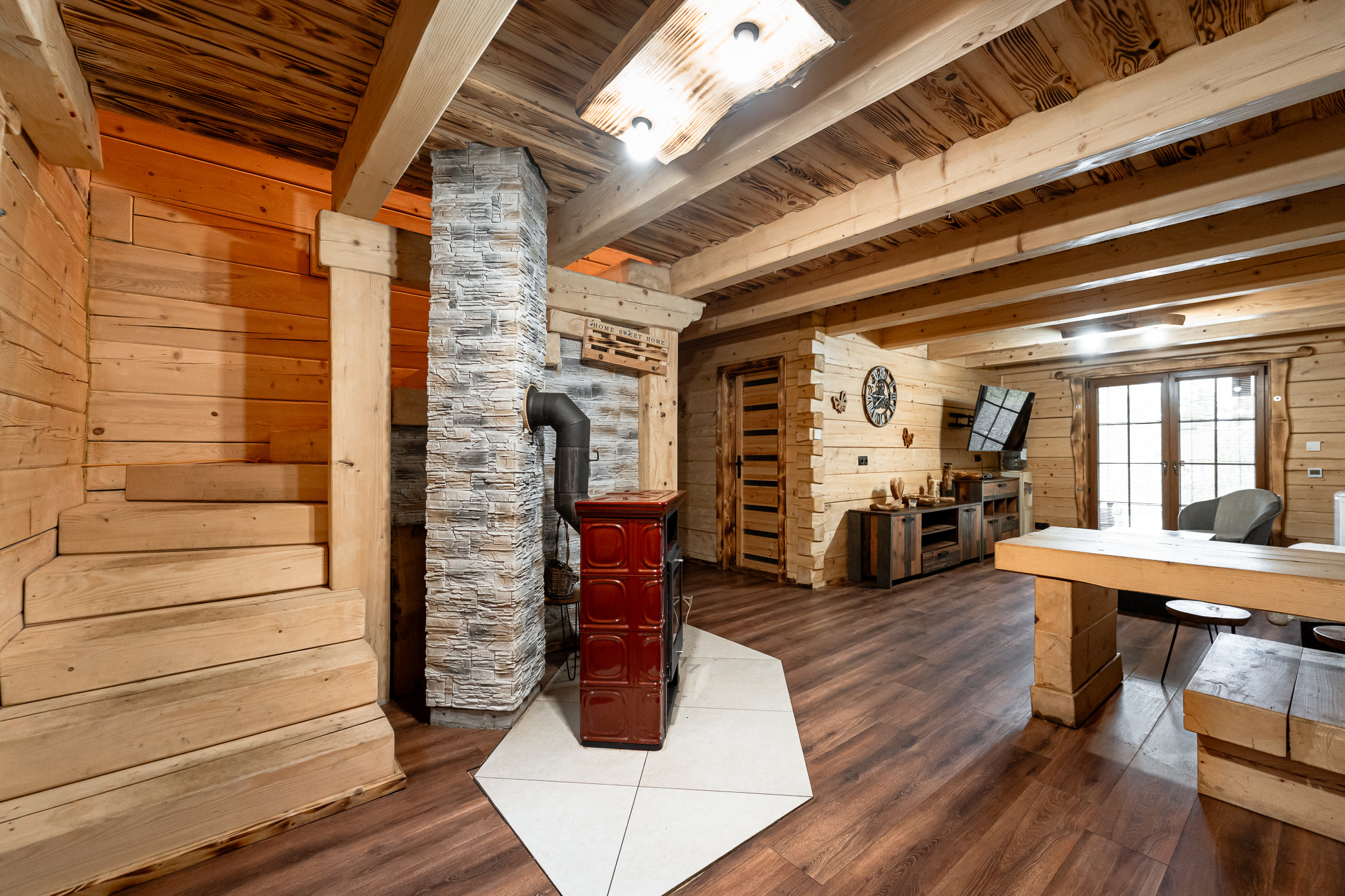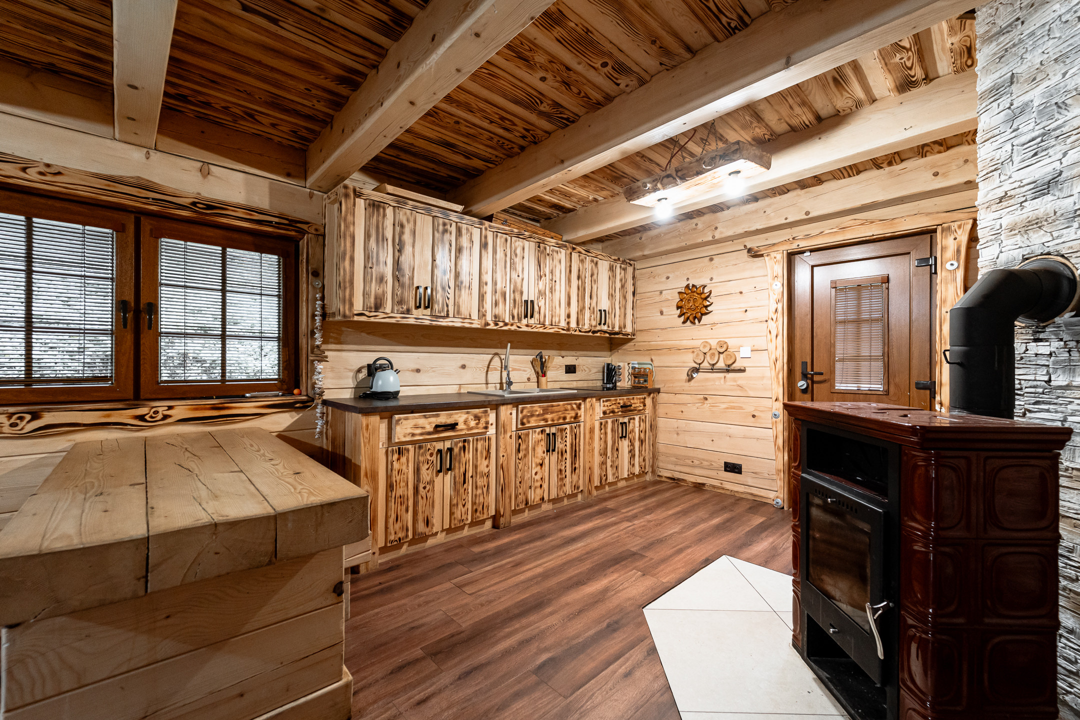 Kúrenie: ústredné – inteligentné elektrické podlahové kúrenie na prízemí + kachľovec na drevo (na poschodí je predpríprava na infrapanely)