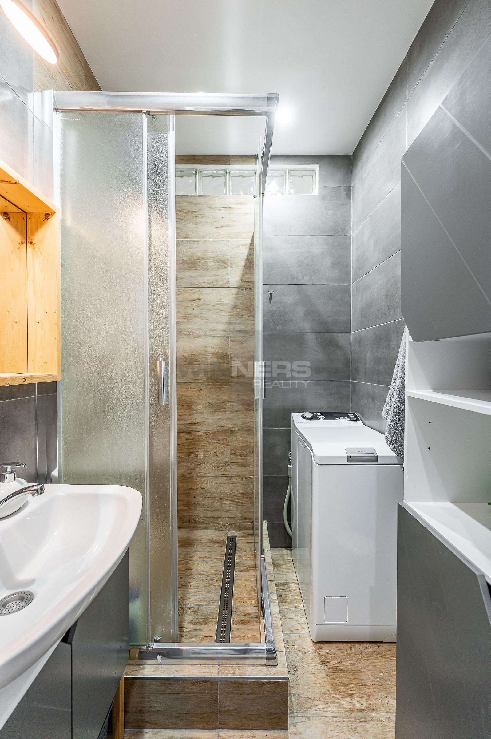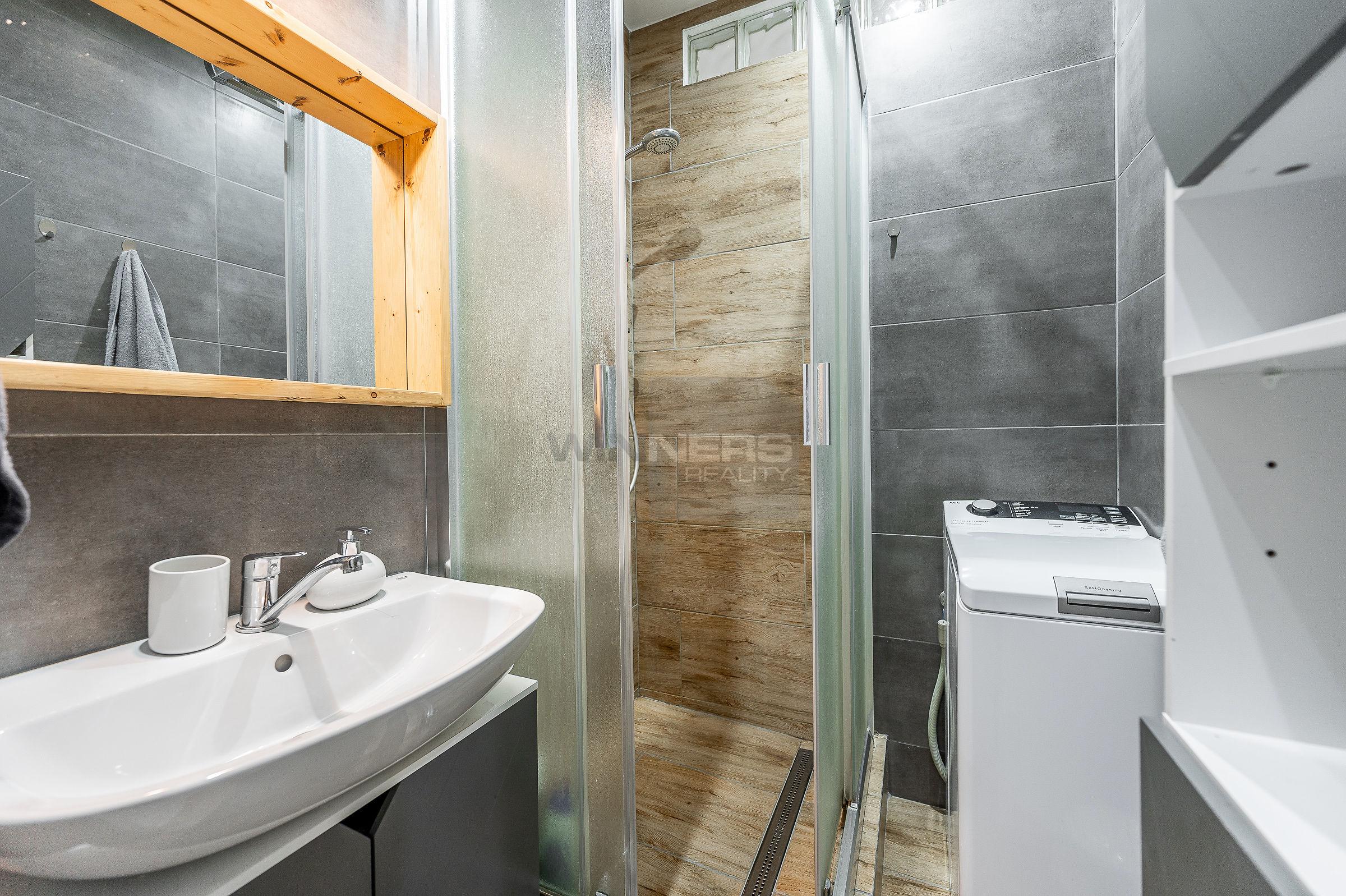 * vstupná chodba, WC, kúpeľňa so sprchovacím kútom a práčkou, kuchyňa, obývačka, spálňa,