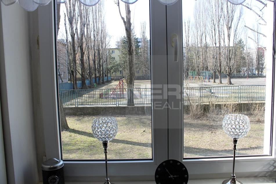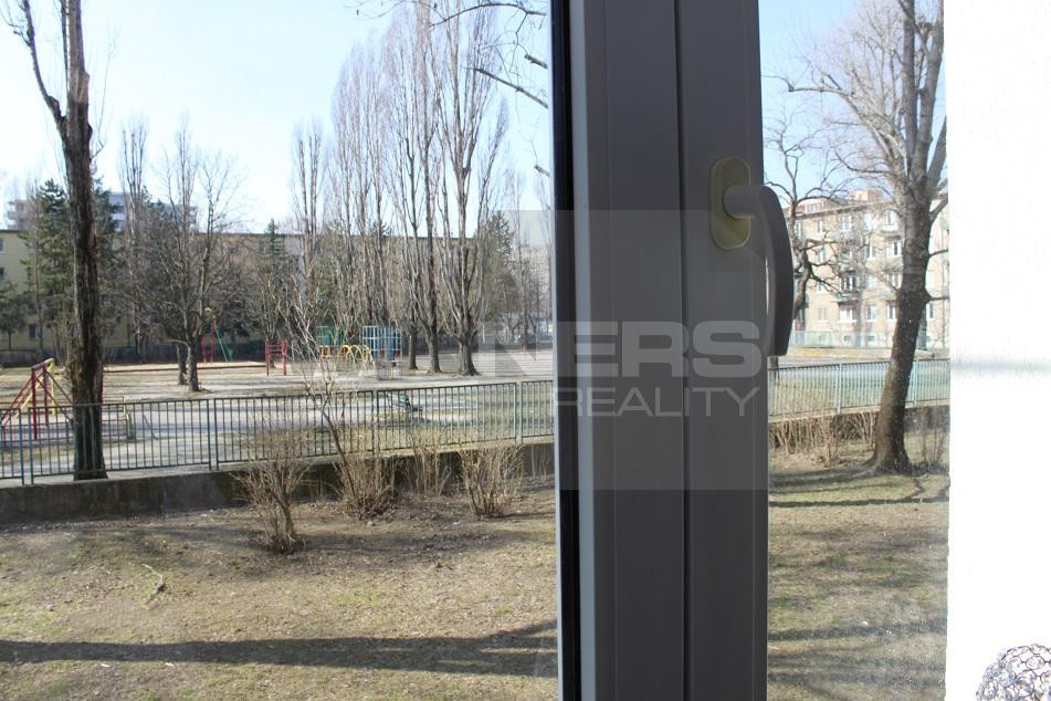 - Okno – plastové s vonkajšou a vnútornou žalúziou s výhľadom do parku.