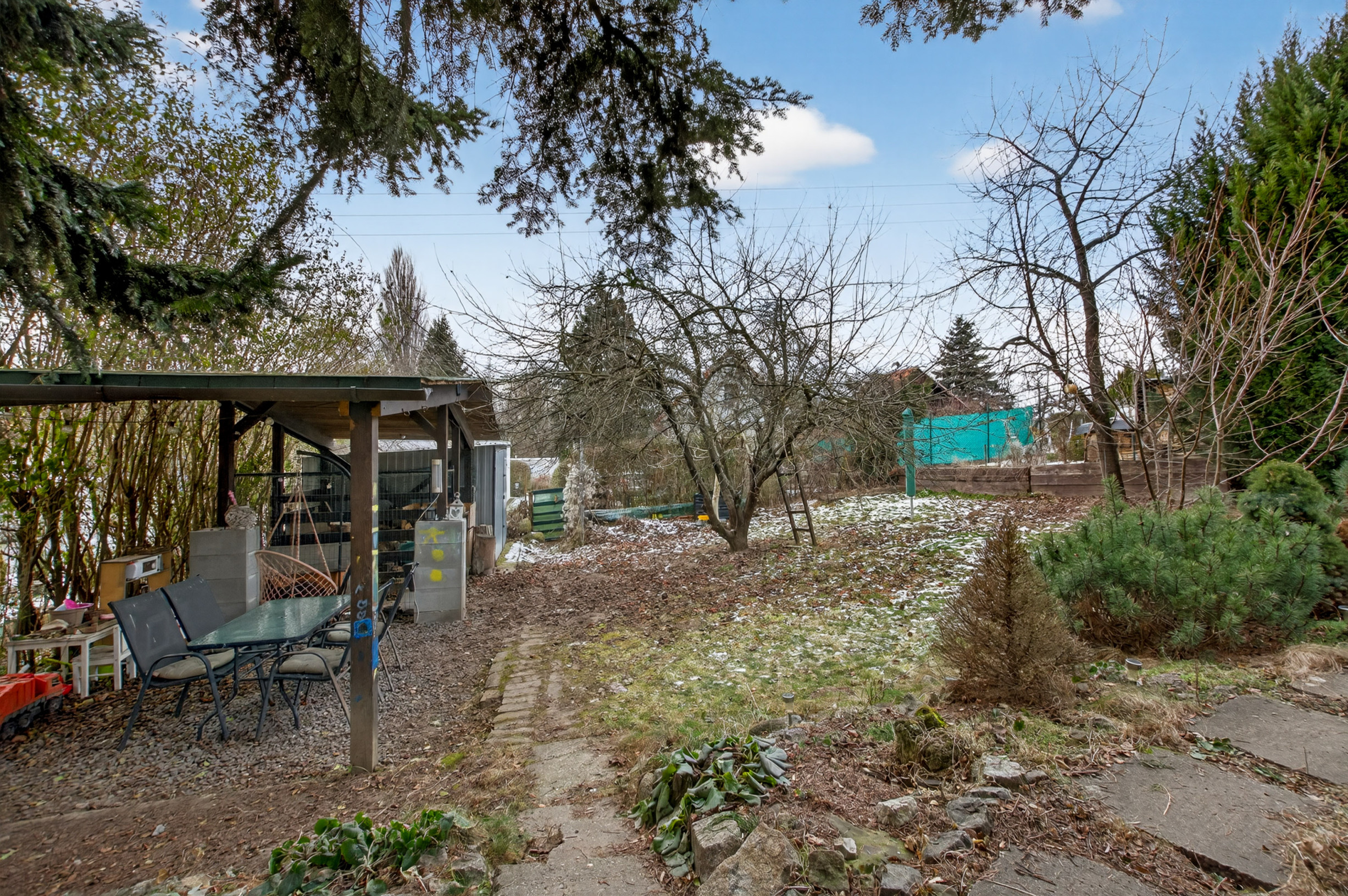 *na pozemku sa nachádza záhradný domček, prístrešok so sedením, ovocné stromy a kríky