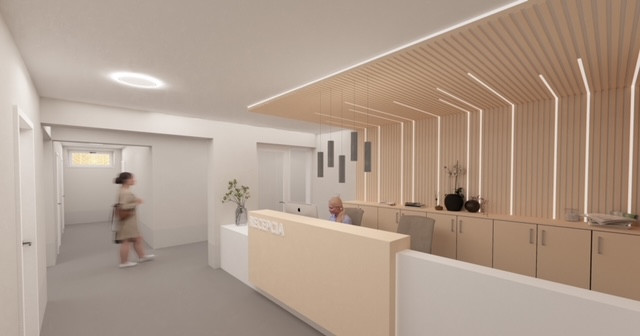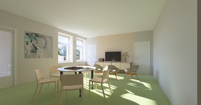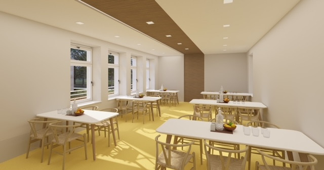 2. nadzemné podlažie disponuje chodbou so schodiskom, spoločenskou miestnosťou, ubytovacími priestormi a priestormi pre hygienu – po rekonštrukcii je v pláne možnosť ďalších ubytovacích kapacít, terapeutických miestností, spoločenských miestností, alebo relaxačných zón.